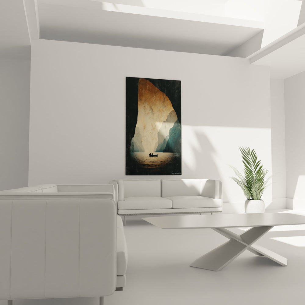 La palette chromatique dorée et bleue de ce tableau évoque la rencontre harmonieuse entre les éléments terrestres et marins. Les tons chauds de la lumière symbolisent l'espoir et la découverte, tandis que les nuances sombres des parois rocheuses représentent le mystère et la profondeur des grottes marines naturelles. Cette dualité coloriste crée une atmosphère à la fois apaisante et mystérieuse, parfaite pour une décoration murale sophistiquée.