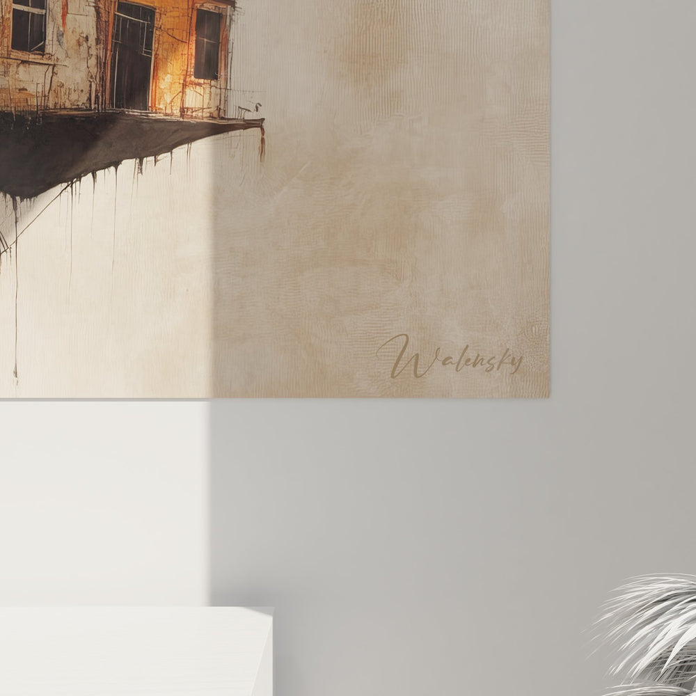 Ce tableau mural bâtiment suspendu présente une vision surréaliste et poétique de l'architecture impossible. L'œuvre dépeint un ensemble d'immeubles anciens aux façades colorées, miraculeusement suspendus dans les airs sur une plateforme sombre. La composition révèle des bâtiments aux tons ocre, beiges et rouille, contrastant avec des touches de bleu pastel qui apportent une fraîcheur nostalgique à l'ensemble. Les fenêtres aux volets partiellement ouverts et les balcons en fer forgé évoquent l'architecture méditerranéenne ou les quartiers historiques européens. Cette représentation artistique urbaine joue avec les codes de la perspective et de la gravité, créant un univers onirique où les structures architecturales défient les lois physiques. Les détails minutieux des façades, les antennes sur les toits et les lignes électriques renforcent le réalisme de cette vision architecturale fantastique. L'artiste a su capturer l'essence de l'habitat urbain dense tout en le sublimant par cette mise en scène extraordinaire. La technique picturale mélange réalisme et imaginaire, offrant une œuvre d'art architectural contemporain qui interroge notre rapport à l'espace et à l'urbanisme moderne.