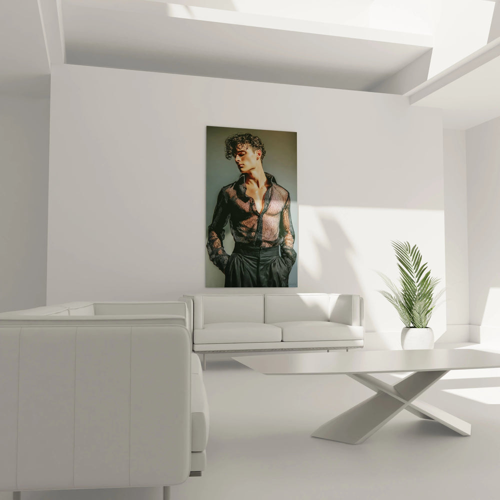 Ce tableau mural beauté masculine représente l'essence de la beauté masculine contemporaine à travers un portrait saisissant qui capture l'élégance et la sensualité moderne. L'œuvre met en scène un jeune homme aux traits délicats et au regard contemplatif, incarnant parfaitement les nouveaux canons esthétiques masculins. La composition photographique révèle une maîtrise technique remarquable, où chaque détail contribue à créer une atmosphère à la fois sophistiquée et intimiste. Le modèle porte une chemise transparente masculine aux motifs géométriques cuivrés, créant un jeu subtil entre révélation et dissimulation qui renforce l'attrait visuel de l'ensemble. Cette pièce vestimentaire, partiellement déboutonnée, dévoile avec élégance le décolleté masculin, ajoutant une dimension sensuelle sans tomber dans la vulgarité. Le pantalon rayé élégant complète harmonieusement la tenue, apportant une touche classique qui équilibre la modernité de la chemise. L'éclairage dramatique sculpte magistralement les volumes du visage et du corps, créant des contrastes saisissants entre lumière et ombres qui accentuent la profondeur émotionnelle du portrait. Cette œuvre d'art mural contemporaine transformera instantanément votre espace de vie en galerie contemporaine, affirmant votre goût pour l'art photographique masculin de qualité et votre sensibilité aux tendances esthétiques actuelles. Ce tableau portrait homme moderne s'intègre parfaitement dans une décoration intérieure sophistiquée où l'art et le style se rencontrent harmonieusement.