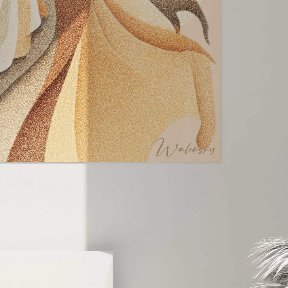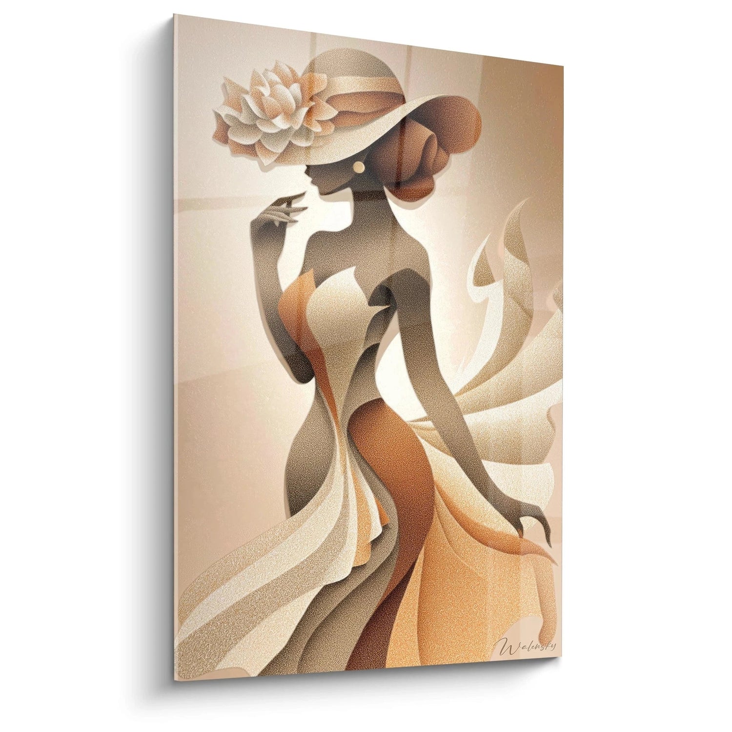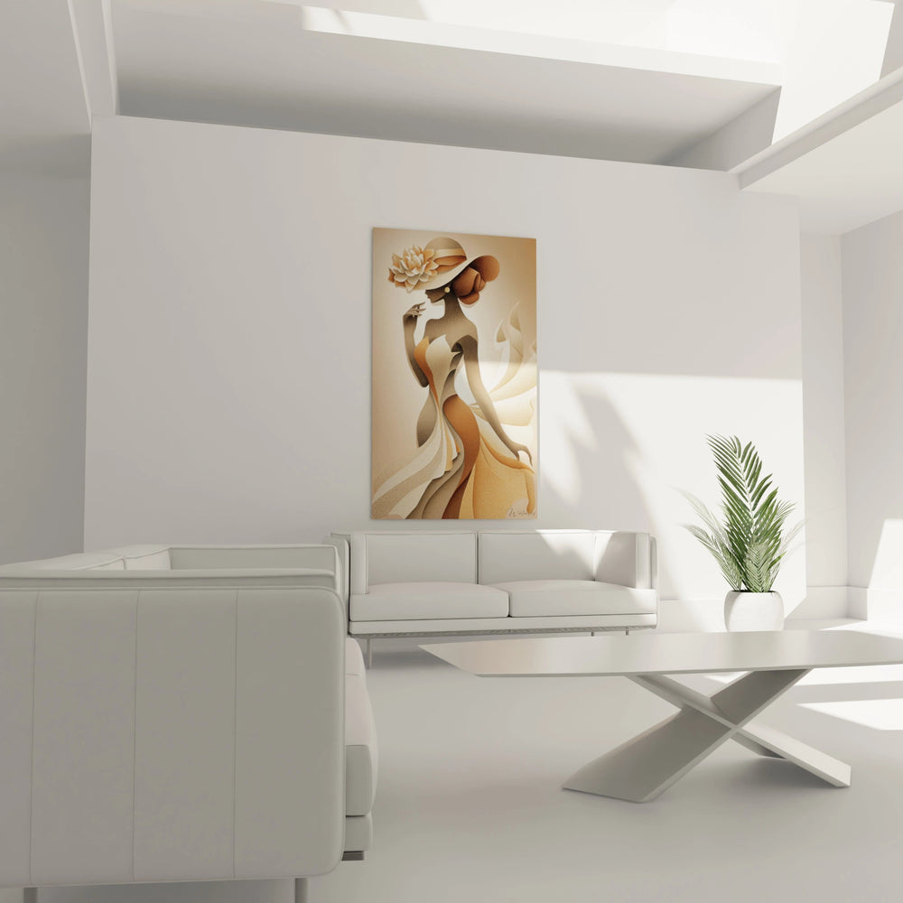 La symbolique de cette œuvre puise dans l'imaginaire de la femme émancipée vintage. Le chapeau représente l'accessoire de mode par excellence, symbole de sophistication et de statut social. Les tons ocre, beige et caramel évoquent la chaleur, la douceur maternelle et la stabilité. Cette palette chromatique chaleureuse crée une atmosphère apaisante décoration murale, parfaite pour un intérieur moderne. Les nuances dorées apportent une touche de luxe et d'éclat, tandis que les tons bronze confèrent une dimension intemporelle à l'ensemble. Cette harmonie colorielle reflète l'équilibre entre tradition et modernité, masculin et féminin, force et délicatesse.