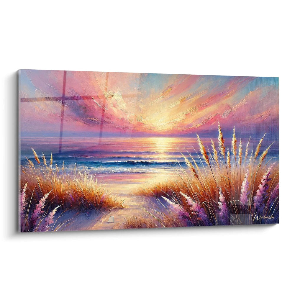 Ce tableau est bien plus qu’un simple décor : c’est une invitation à la rêverie. Les touches fluides et délicates rendent hommage à ce moment précieux où le soleil dépose ses teintes chaleureuses sur les vagues paisibles. Vous sentirez presque la brise légère qui caresse les herbes folles en avant-plan, vous offrant un refuge apaisant après une journée intense.