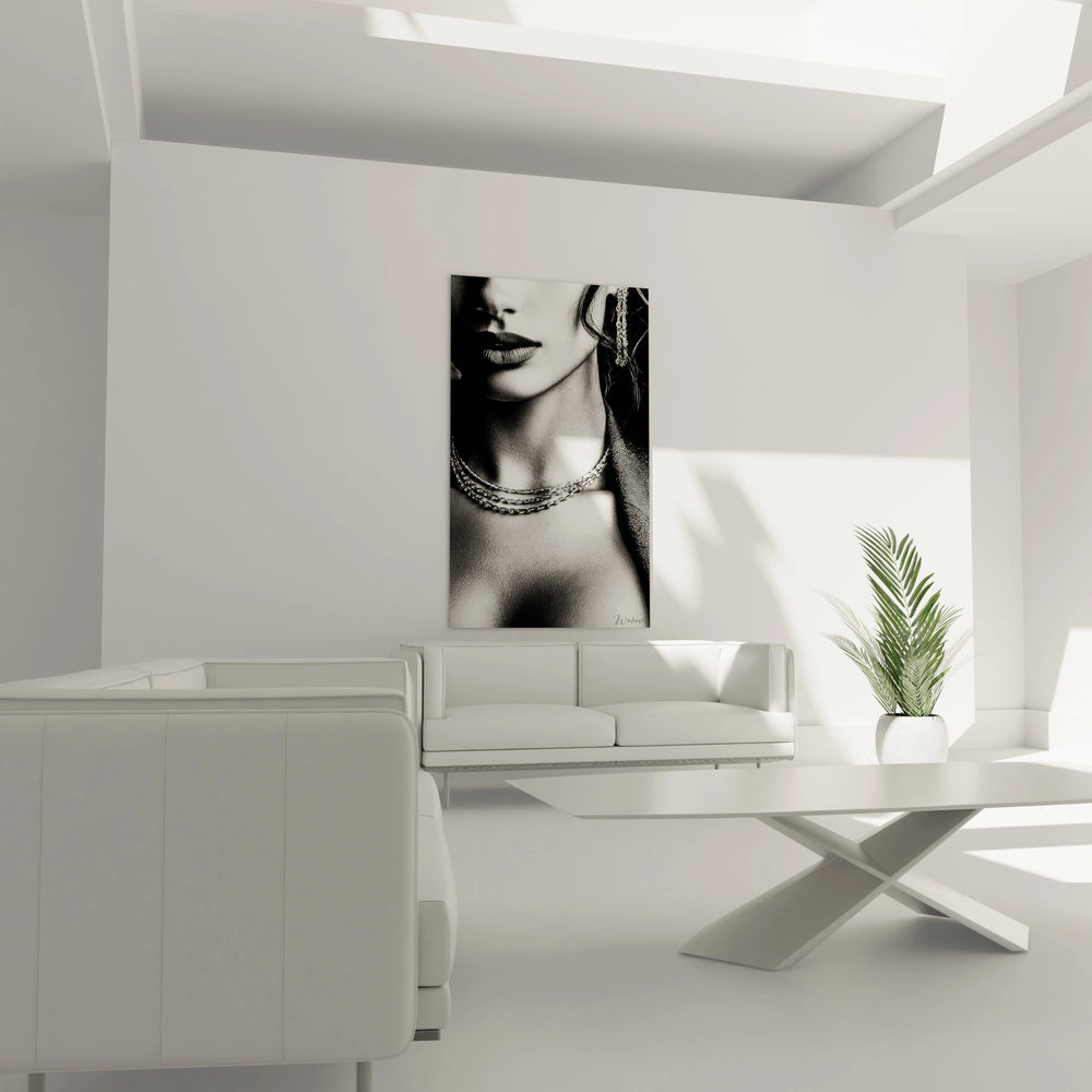 Ce tableau mural accessoires de mode présente une photographie artistique en noir et blanc d'une remarquable intensité visuelle. L'œuvre capture avec finesse le portrait partiel d'une femme, mettant particulièrement l'accent sur la sensualité de ses lèvres délicatement ourlées et la sophistication de sa parure de bijoux. La composition révèle une superposition harmonieuse de colliers métalliques qui créent un jeu de lignes et de textures captivant. Ces chaînes argentées, disposées en cascade autour du cou gracieux, reflètent subtilement la lumière et apportent une dimension sculpturale à l'ensemble.