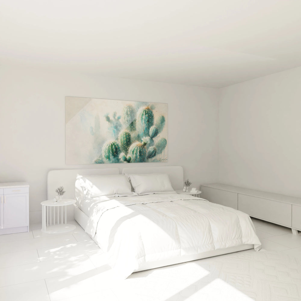 Conçu à partir d’une fascination pour la résilience des cactus dans des environnements extrêmes, ce tableau incarne l’équilibre parfait entre robustesse et grâce. Comme une caresse visuelle, les textures légères flirtent avec des nuances subtilement aquarellées, réveillant en vous cette sensation apaisante de la lumière dorée filtrant au cœur du désert. Ce contraste puissant entre l’aspect rude des plantes et la délicatesse de leurs fleurs invite à percevoir la beauté insoupçonnée qui naît des épreuves.