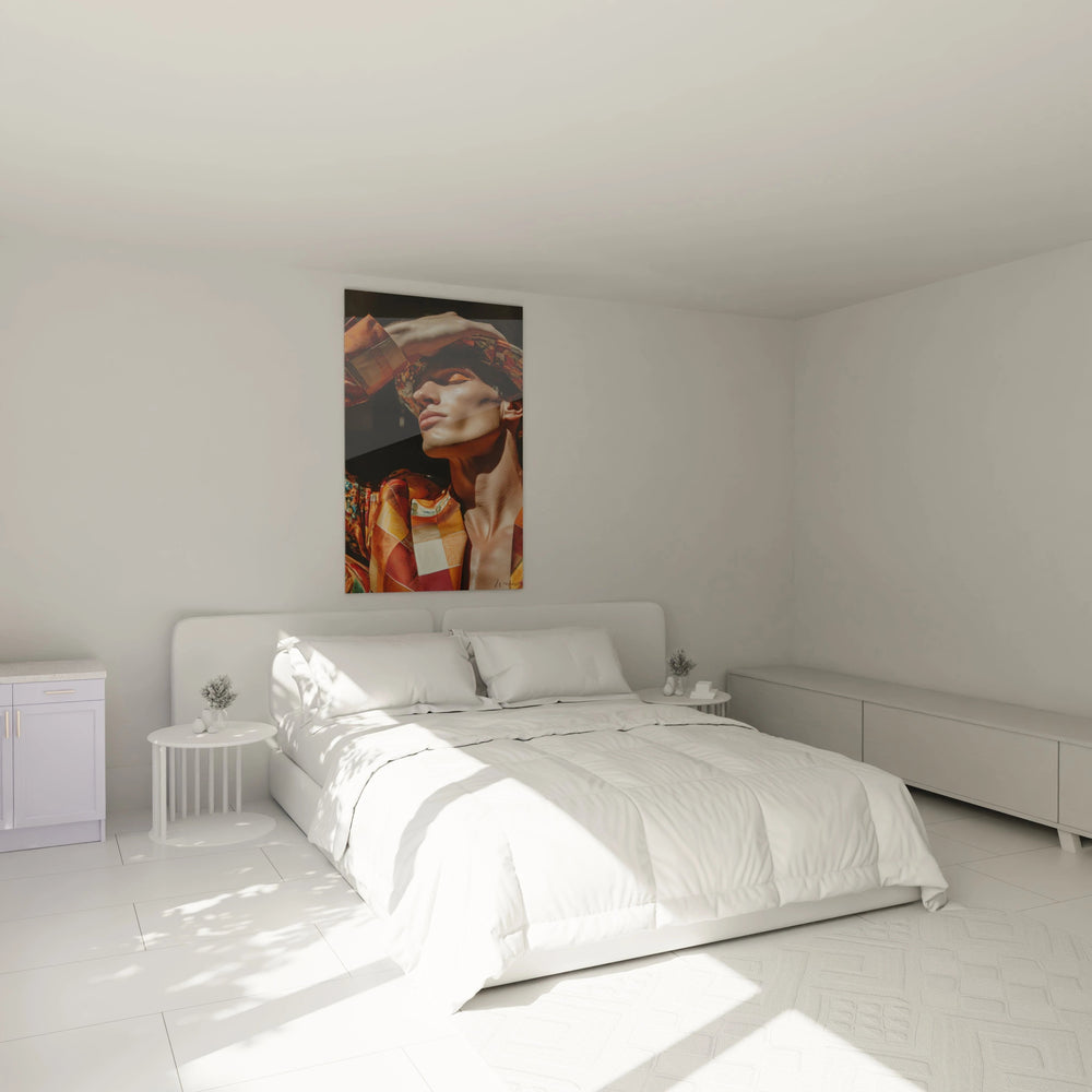 Le foulard, élément central de la composition, s'enroule avec grâce autour de la tête du modèle, créant un drapé qui évoque les maîtres de la peinture classique. Les motifs colorés apportent une dimension décorative et culturelle à l'ensemble, suggérant des influences méditerranéennes ou orientales. Cette pièce murale masculine s'impose comme une célébration de la beauté masculine moderne, alliant tradition artistique et vision contemporaine dans une harmonie parfaite.