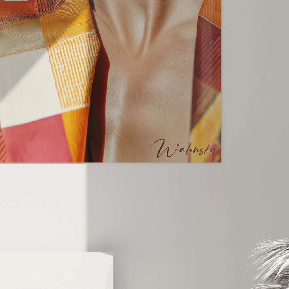 Ce tableau mural beauté masculine présente une œuvre d'art photographique exceptionnelle mettant en scène un portrait masculin d'une beauté saisissante. L'image capture un homme aux traits finement ciselés, arborant un foulard coloré aux motifs géométriques et floraux dans une palette de couleurs chaudes dominée par l'orange, le rouge et l'ocre. La composition artistique révèle une approche contemporaine du portrait classique masculin, où la masculinité s'exprime à travers une esthétique raffinée et sensuelle.