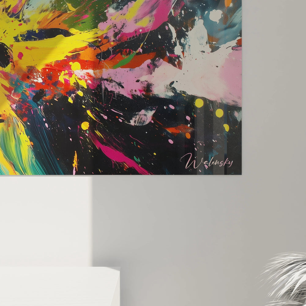 La composition de cette œuvre est savamment organisée autour d'un point focal central d'où émergent toutes les projections colorées. Cette structure radiante crée un mouvement centrifuge extrêmement dynamique, où les couleurs semblent littéralement jaillir vers le spectateur. Le fond noir profond agit comme un espace cosmique infini, amplifiant l'effet des éclaboussures lumineuses qui s'en détachent avec une intensité remarquable.