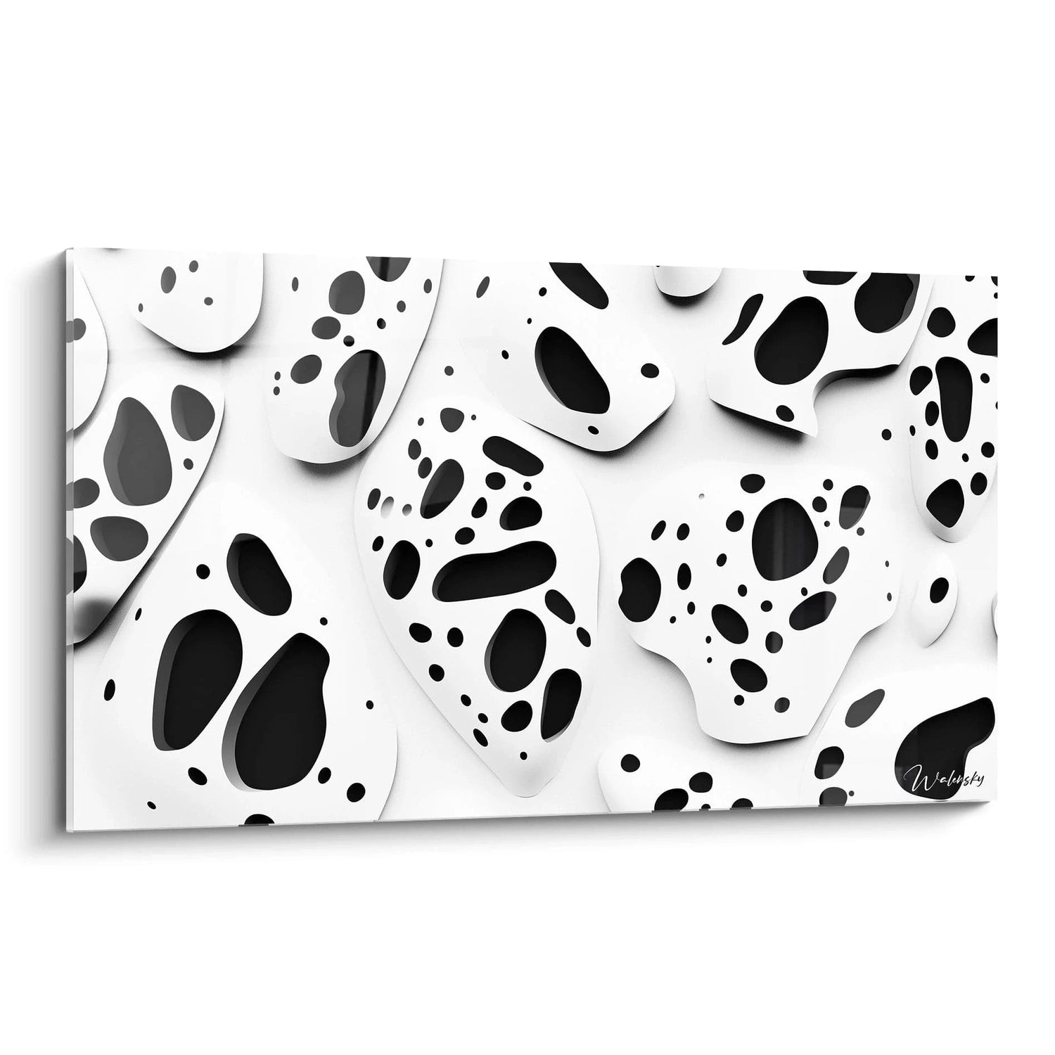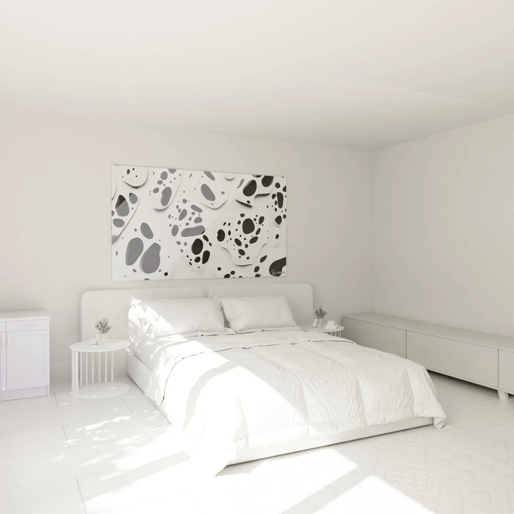 Laissez-vous captiver par l’intensité de ses taches noires, ponctuant un fond immaculé avec une grâce spontanée. Chaque détail respire la vie, évoquant des éclats naturels et une poésie abstraite, comme un souffle délicat suspendu dans le temps. Ce dialogue entre lumière et ombre crée un équilibre fascinant, où chaque regard révèle un nouvel univers, une émotion différente à chaque instant.
