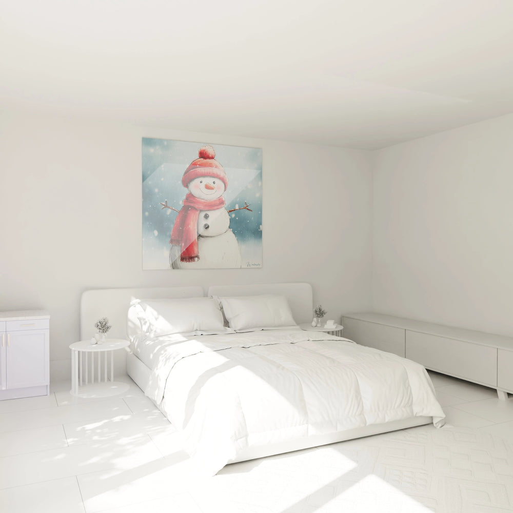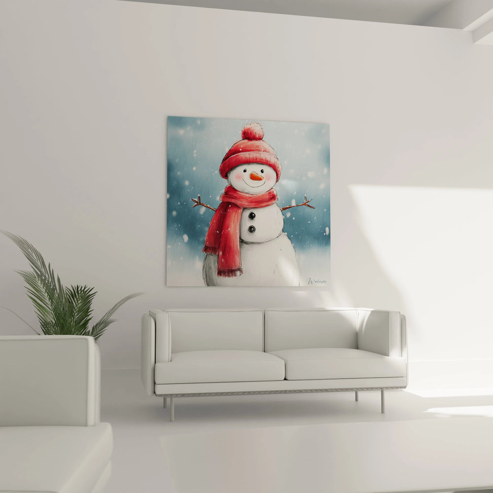 Ce tableau bonhomme de neige présente un personnage hivernal au sourire chaleureux, vêtu d'accessoires rouges éclatants qui contrastent magnifiquement avec sa silhouette blanche. L'œuvre capture l'essence de la joie hivernale avec un tableau bonhomme de neige souriant aux joues rosies et aux yeux pétillants. La composition révèle un décoration murale bonhomme de neige parfaitement équilibré, positionné au centre d'un paysage enneigé. Les flocons de neige qui dansent autour du personnage créent une atmosphère magique et donnent vie à cette art mural bonhomme de neige festif. Le caractère distinctif de cette œuvre réside dans l'expression bienveillante du bonhomme et la richesse des détails de ses accessoires textiles.