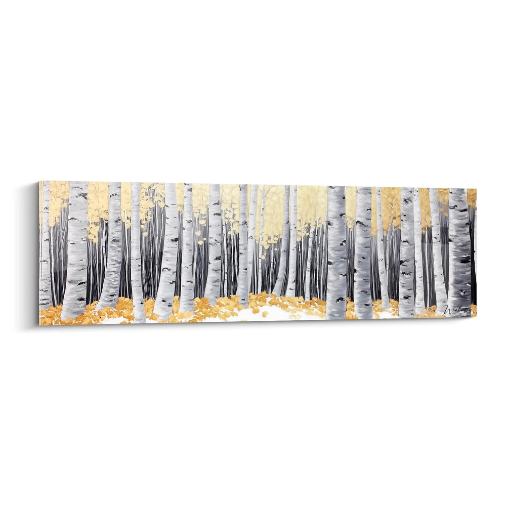Ce tableau bouleau présente une forêt majestueuse de bouleaux aux troncs blancs caractéristiques, striés de marques noires naturelles. L'œuvre capture l'essence d'une forêt automnale où les tableau bouleau automne doré révèle des feuillages éclatants dans des tons chauds. Les troncs élancés s'élèvent verticalement, créant un rythme visuel hypnotique qui guide le regard vers les frondaisons dorées. Cette décoration murale bouleau transforme instantanément l'espace par sa présence apaisante et sa connexion directe avec la nature. L'aspect panoramique de l'œuvre amplifie l'immersion dans cette forêt enchanteresse.