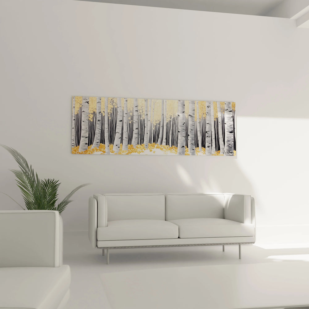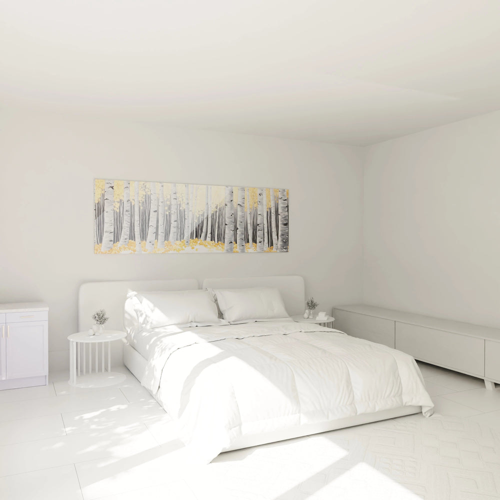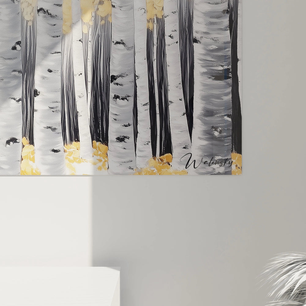 L'expérience visuelle de cette tableau bouleau grand format évolue selon la distance d'observation. À distance rapprochée, les détails minutieux de l'écorce révèlent la texture caractéristique du bouleau avec ses stries noires sur fond blanc. L'examen attentif dévoile les nuances subtiles dans les tons dorés des feuilles. À distance éloignée, l'effet global révèle l'immensité de cette forêt et son caractère apaisant. Cette tableau bouleau perspective profonde utilise les variations de netteté pour guider naturellement l'œil à travers les différents plans de la composition, créant une sensation d'immersion totale dans l'environnement forestier.
