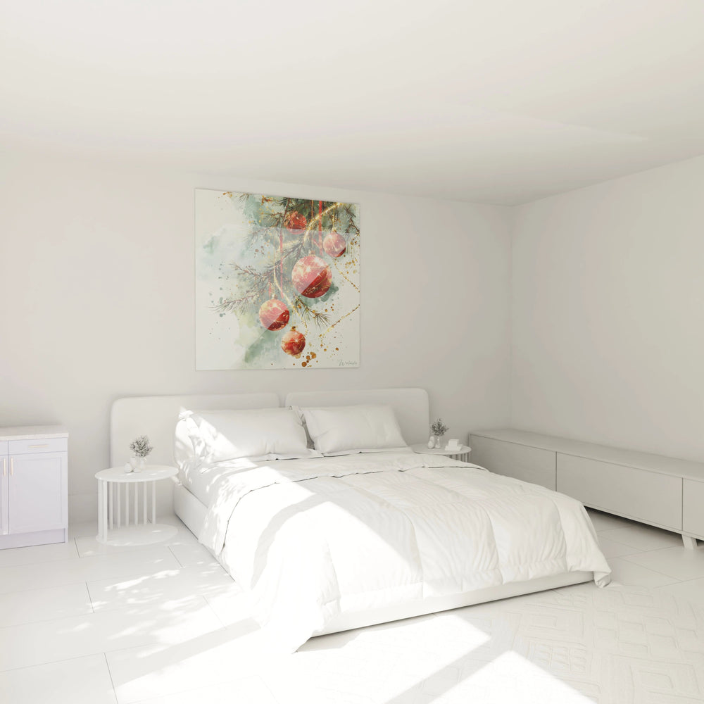 Cette œuvre d'art murale se distingue par sa représentation délicate d'ornements de Noël traditionnels suspendus à des branches de conifère. Les tableau boules dorées et rouges présentent des surfaces réfléchissantes parfaitement maîtrisées, créant des jeux de lumière sophistiqués. Chaque sphère décorative révèle des nuances subtiles allant du rouge carmin au rouge vermillon, rehaussées par des touches dorées qui accrochent la lumière. L'artiste a su capturer la texture lisse et brillante des ornements tout en préservant leur caractère précieux et fragile. Cette art mural boules témoigne d'une technique aquarelle maîtrisée où les coulures et projections spontanées contrastent avec la précision des détails.
