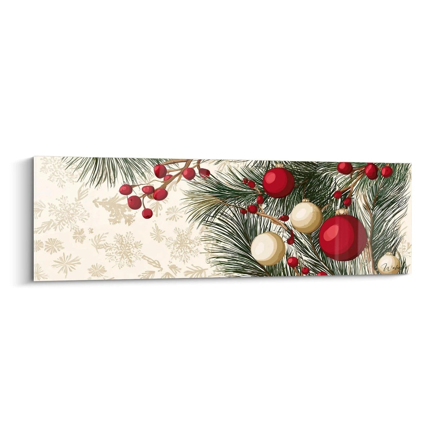 Ce tableau sapin révèle immédiatement sa splendeur festive à travers une composition harmonieuse d'éléments naturels et d'ornements traditionnels. Les branches de conifère s'étendent majestueusement sur la surface, créant un cadre végétal d'une rare élégance. Le tableau sapin décoratif rouge et or captive par ses boules scintillantes disposées avec un équilibre parfait. Les baies écarlates parsemées naturellement complètent cette symphonie visuelle, tandis qu'un délicat motif de flocons de neige en arrière-plan évoque la magie hivernale. Cette décoration murale sapin transforme instantanément l'espace par sa présence chaleureuse et sa richesse chromatique exceptionnelle.