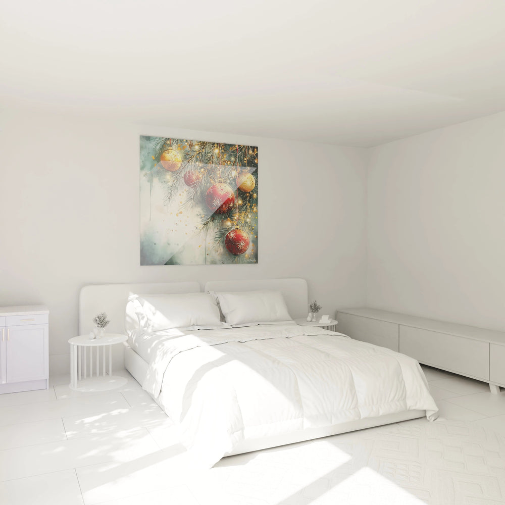 Ce tableau boules Noël dévoile une composition artistique d'une rare élégance, mettant en scène des ornements festifs suspendus aux branches d'un sapin. Les tableau boules Noël dorées et rouges créent un contraste saisissant avec les aiguilles vert-gris du conifère. Cette décoration murale boules Noël capture parfaitement l'esprit des fêtes grâce à ses détails minutieux et ses reflets chatoyants. Les lumières dorées parsemées dans la composition apportent une dimension magique à l'ensemble, transformant cette œuvre en véritable fenêtre sur la magie hivernale.