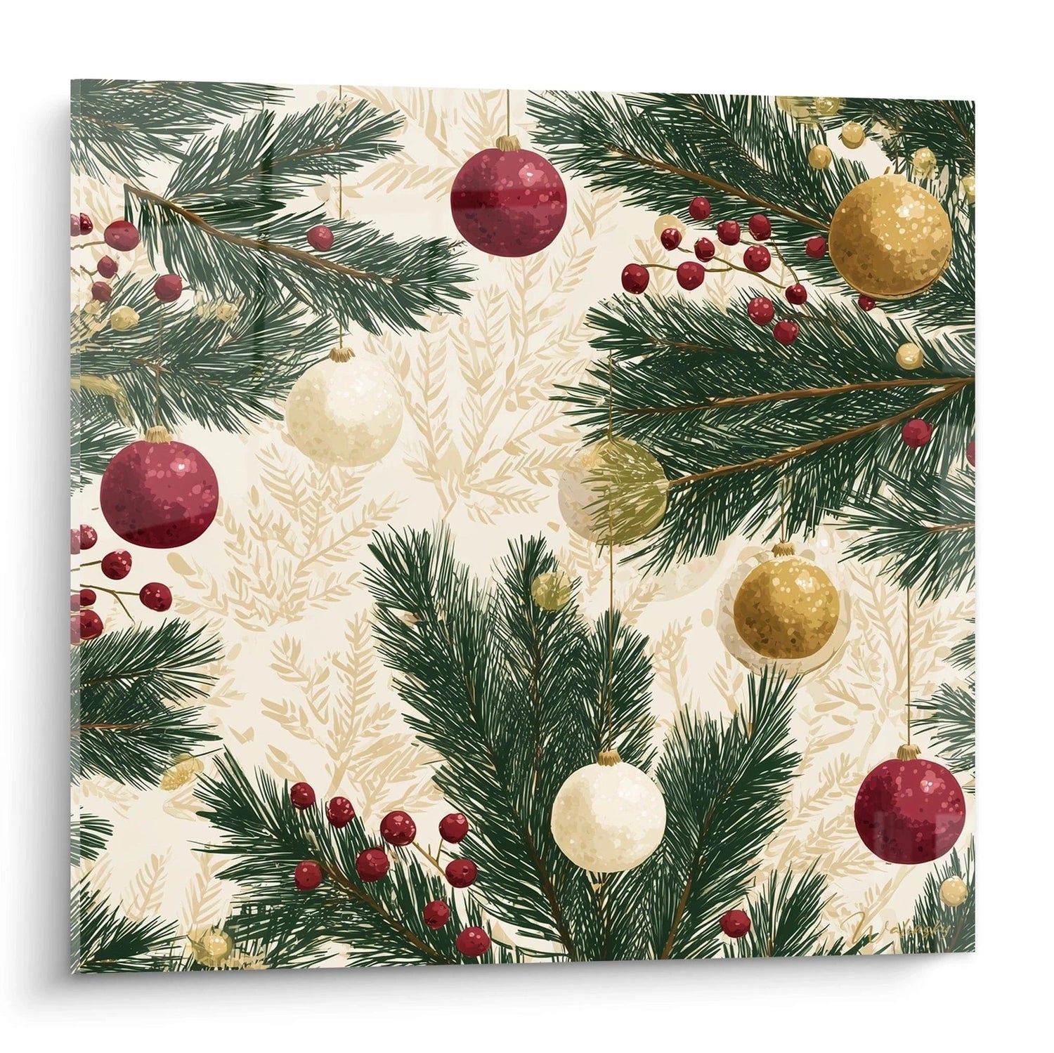 Ce tableau branches sapins présente une composition festive exceptionnelle mettant en scène des branches de conifères ornées de décorations traditionnelles. L'œuvre révèle immédiatement son caractère saisonnier à travers la présence de boules de Noël dorées et bordeaux suspendues avec élégance. Cette décoration murale branches sapins capture parfaitement l'essence des fêtes de fin d'année grâce à ses éléments botaniques authentiques. Les branches vertes profondes contrastent magnifiquement avec les ornements scintillants, créant une harmonie visuelle saisissante. L'ensemble évoque instantanément l'atmosphère chaleureuse et festive propre aux célébrations hivernales, faisant de cette œuvre un choix parfait pour apporter l'esprit des fêtes dans tout intérieur.
