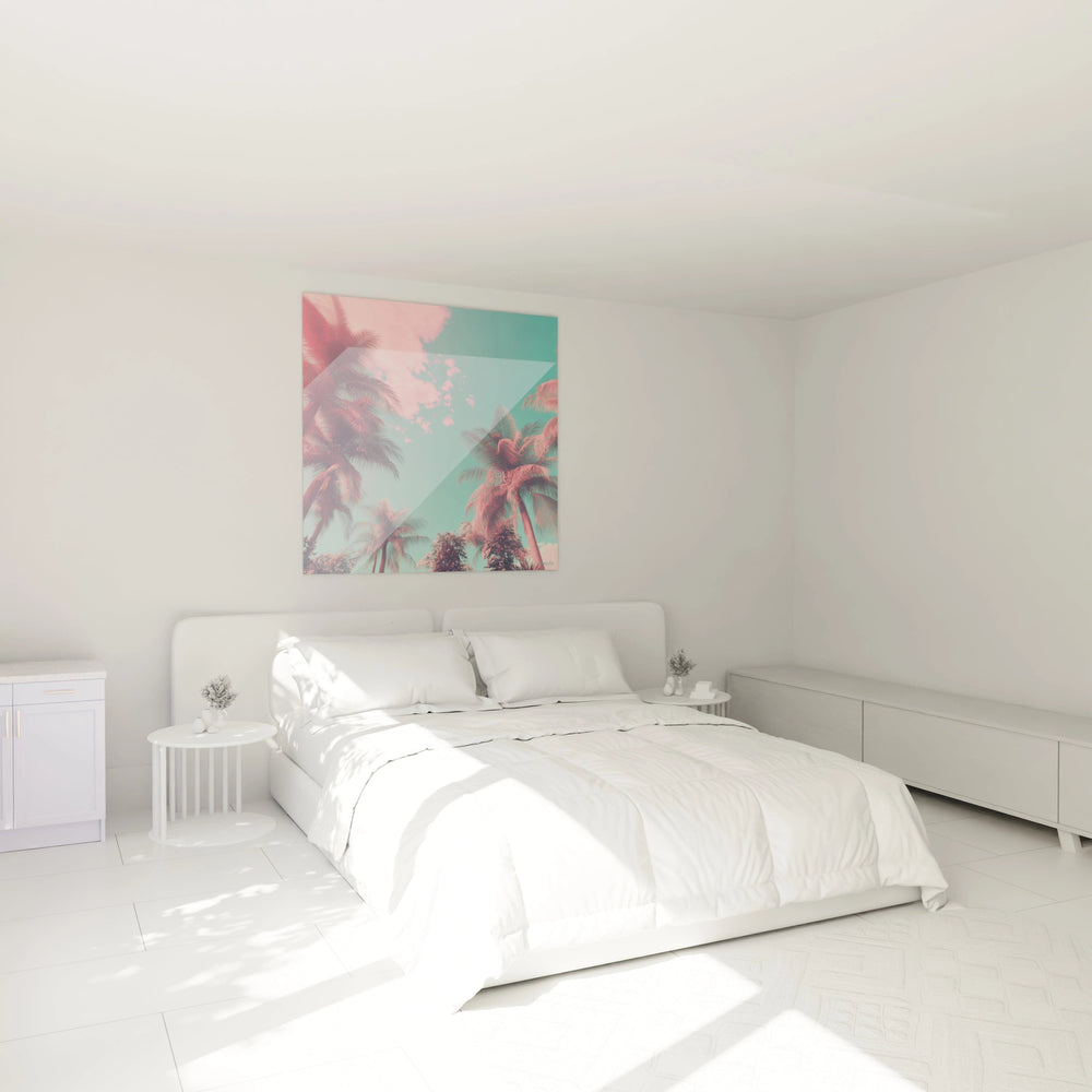 Les silhouettes des palmiers apparaissent en rose corail intense, se détachant avec force sur le fond turquoise du ciel. Cette inversion des couleurs attendues confère au tableau palmier une dimension surréaliste tout en restant étrangement familière. Les variations de luminosité et de saturation créent des zones de transition parfaitement fondues entre les deux dominantes chromatiques. Les trois couleurs principales de cette œuvre sont le rose, le turquoise, et le vert émeraude qui apparaît subtilement dans les frondaisons.
