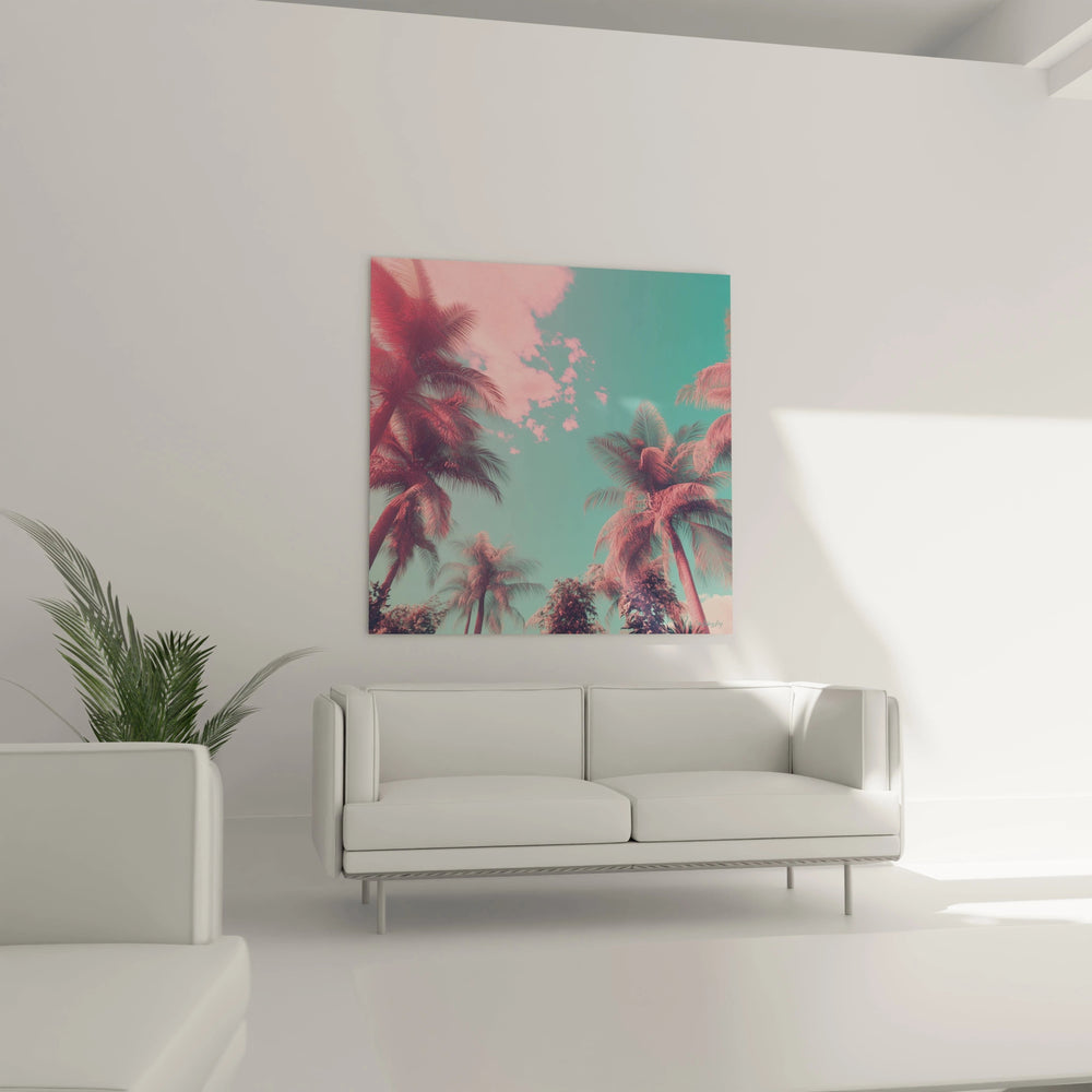 Découvrez ce magnifique tableau palmier qui capture l'essence même d'un paradis tropical avec une atmosphère rêveuse. L'œuvre présente des palmiers en contre-plongée se détachant sur un ciel bicolore spectaculaire, mêlant turquoise profond et rose vaporeux. La perspective unique depuis le sol crée une sensation d'immersion totale, comme si vous vous trouviez réellement sous ces majestueuses silhouettes tropicales. La tonalité chromatique distinctive transforme ce paysage en vision presque surréaliste.