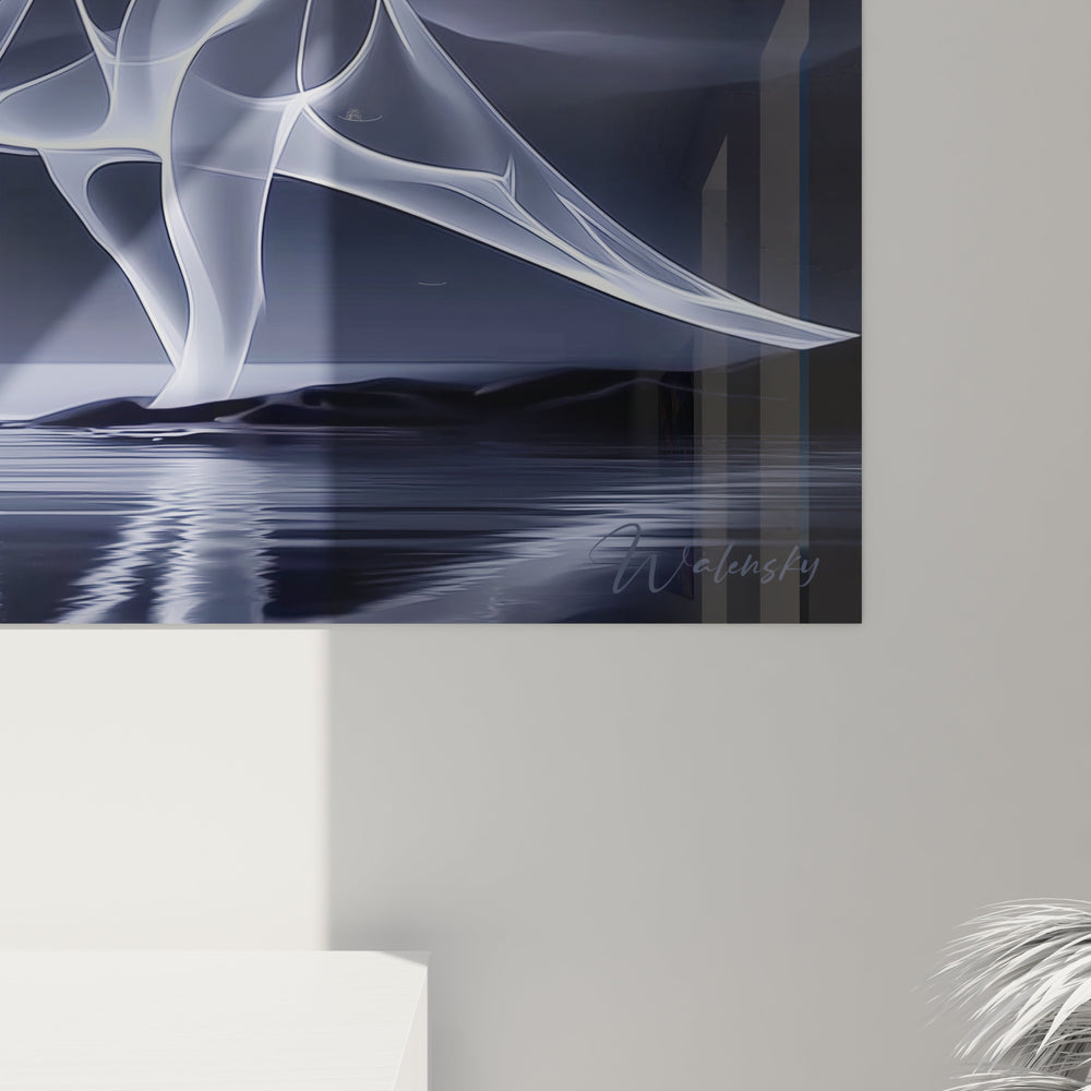 Ce tableau mural dinosaure présente une vision artistique saisissante de brontosaures lumineux évoluant dans un environnement futuriste. L'œuvre met en scène deux dinosaures herbivores de taille différente, suggérant une relation parent-enfant, rendus avec un effet de transparence et de lumière qui leur confère une dimension spectrale fascinante. Le tableau dinosaure moderne utilise une technique de rendu 3D sophistiquée où les contours des créatures semblent tracés par des filaments lumineux bleus et blancs, créant un contraste saisissant avec l'arrière-plan sombre et architectural. Cette décoration murale dinosaure transforme ces géants préhistoriques en êtres éthérés, presque fantomatiques, qui semblent flotter au-dessus d'une surface réfléchissante. L'artiste a choisi de représenter ces sauropodes dans un style néon futuriste qui évoque à la fois la technologie holographique et l'art numérique contemporain. Le tableau art dinosaure capture parfaitement l'essence majestueuse de ces créatures tout en les réinventant dans un contexte visuel moderne et innovant.