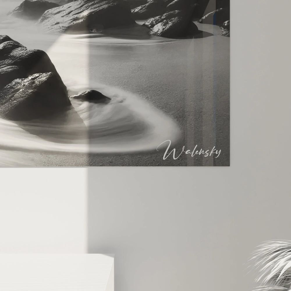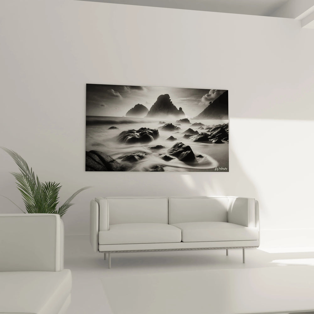 Imaginez un instant suspendu, où la brume marine enveloppe délicatement les rochers, et la lumière tamisée joue entre ombre et clarté. Ce tableau vous invite à plonger dans cette atmosphère mystique et apaisante, capturant l’essence même de la mer dans une palette exclusive de noir, blanc et gris.