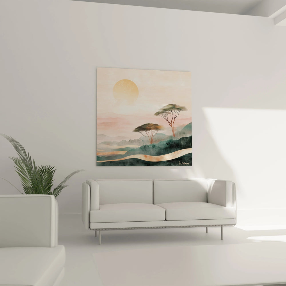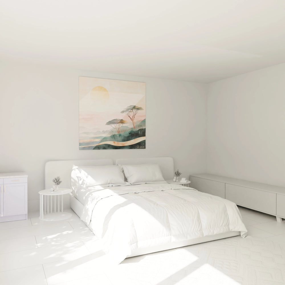 Chaque détail de cette œuvre a été pensé pour vous transporter dans un univers de calme et de contemplation. Les sentiers sinueux, doucement dessinés, vous invitent à un parcours intime à travers un paysage délicatement enveloppé de brume. Les nuances rosées, bleutées et blanches se fondent avec grâce, créant une harmonie visuelle qui évoque la lumière fragile de l’aube.
