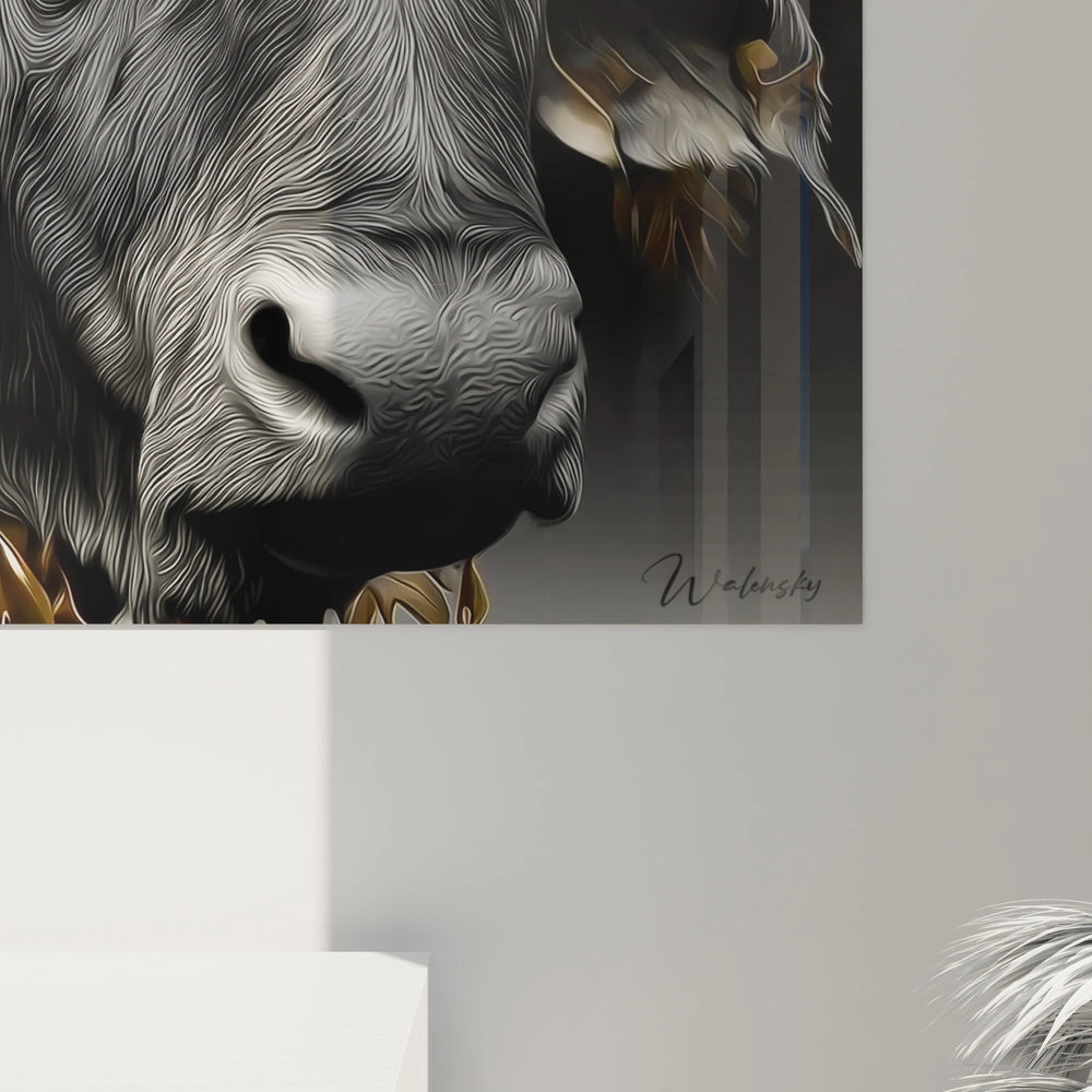 La palette chromatique de ce tableau décoratif buffle s'articule autour d'un camaïeu de gris métalliques sublimés par des accents dorés éclatants. Cette œuvre d'art animalière véhicule des symboles puissants : le buffle incarne la détermination, la protection du clan et la connexion profonde avec la terre ancestrale. Les tons dorés évoquent la lumière dorée des savanes africaines au coucher du soleil.
