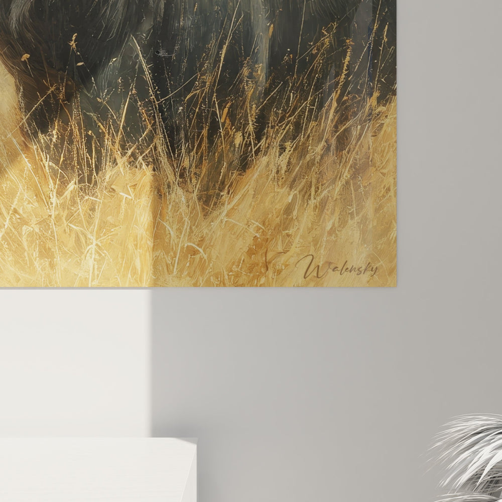 La symbolique du buffle évoque la force, la détermination et la résilience face aux défis de la vie sauvage. Les tons ocre et dorés dominent cette composition, créant une atmosphère chaleureuse qui évoque les couchers de soleil sur la savane. Le contraste entre le pelage sombre de l'animal et les herbes dorées crée un équilibre visuel parfait, symbolisant l'harmonie entre l'animal et son habitat naturel.