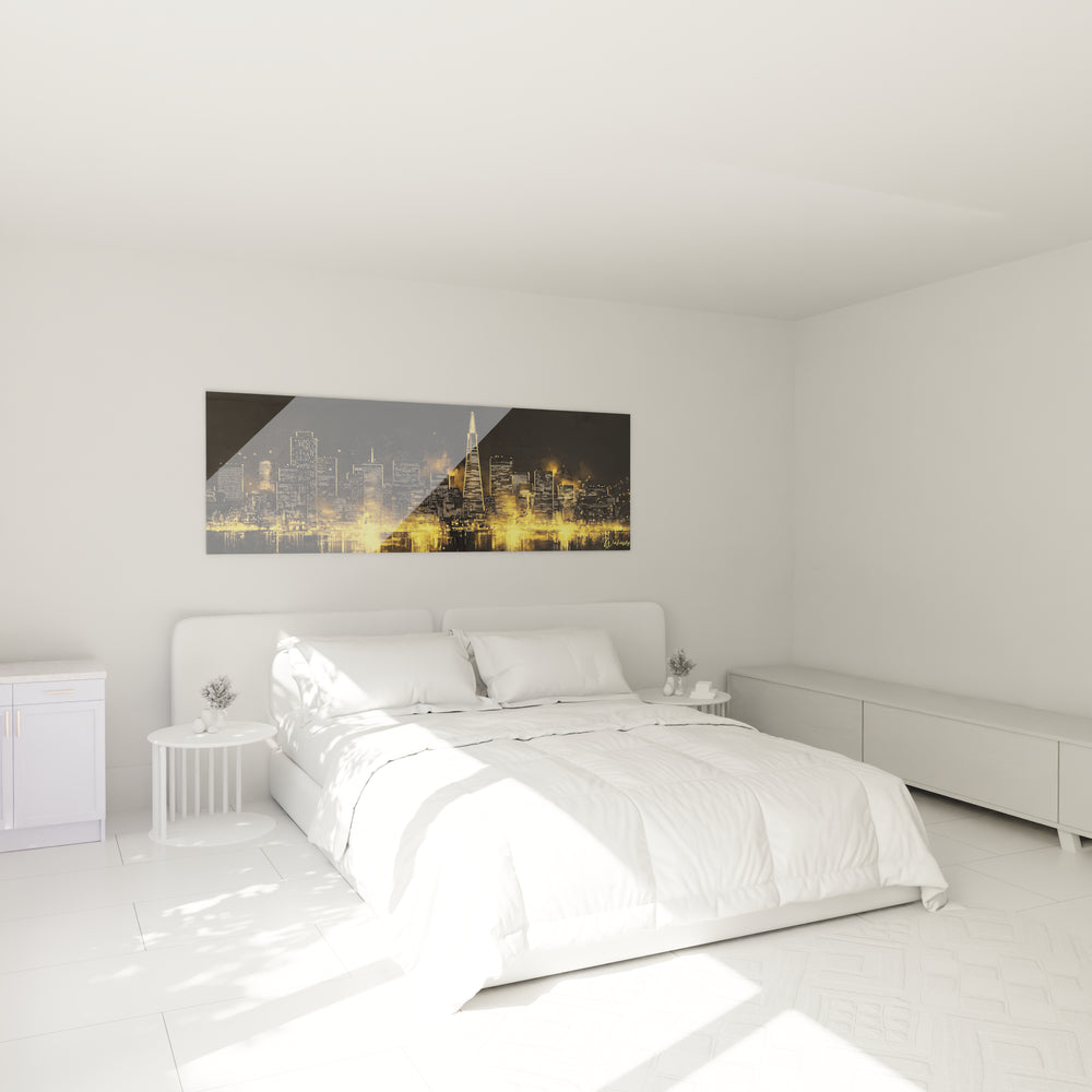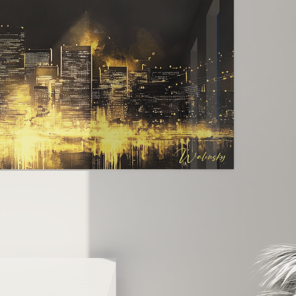 L'unicité de ce tableau skyline réside dans sa capacité à transformer un paysage urbain conventionnel en vision poétique. L'élément distinctif principal est cette zone de reflets dorés floutés qui occupe le tiers inférieur, créant un effet de double exposition fascinant. La tour pyramidale illuminée en or constitue le point focal signature de cette composition, se détachant avec élégance parmi l'ensemble architectural. Cette art mural urbain se distingue également par son format panoramique allongé qui amplifie la sensation d'immensité métropolitaine. Les jeux de transparence entre les différents plans architecturaux et l'intégration harmonieuse des sources lumineuses multiples font de cette œuvre un exemple remarquable de l'art urbain contemporain, impossible à reproduire dans ses nuances subtiles.