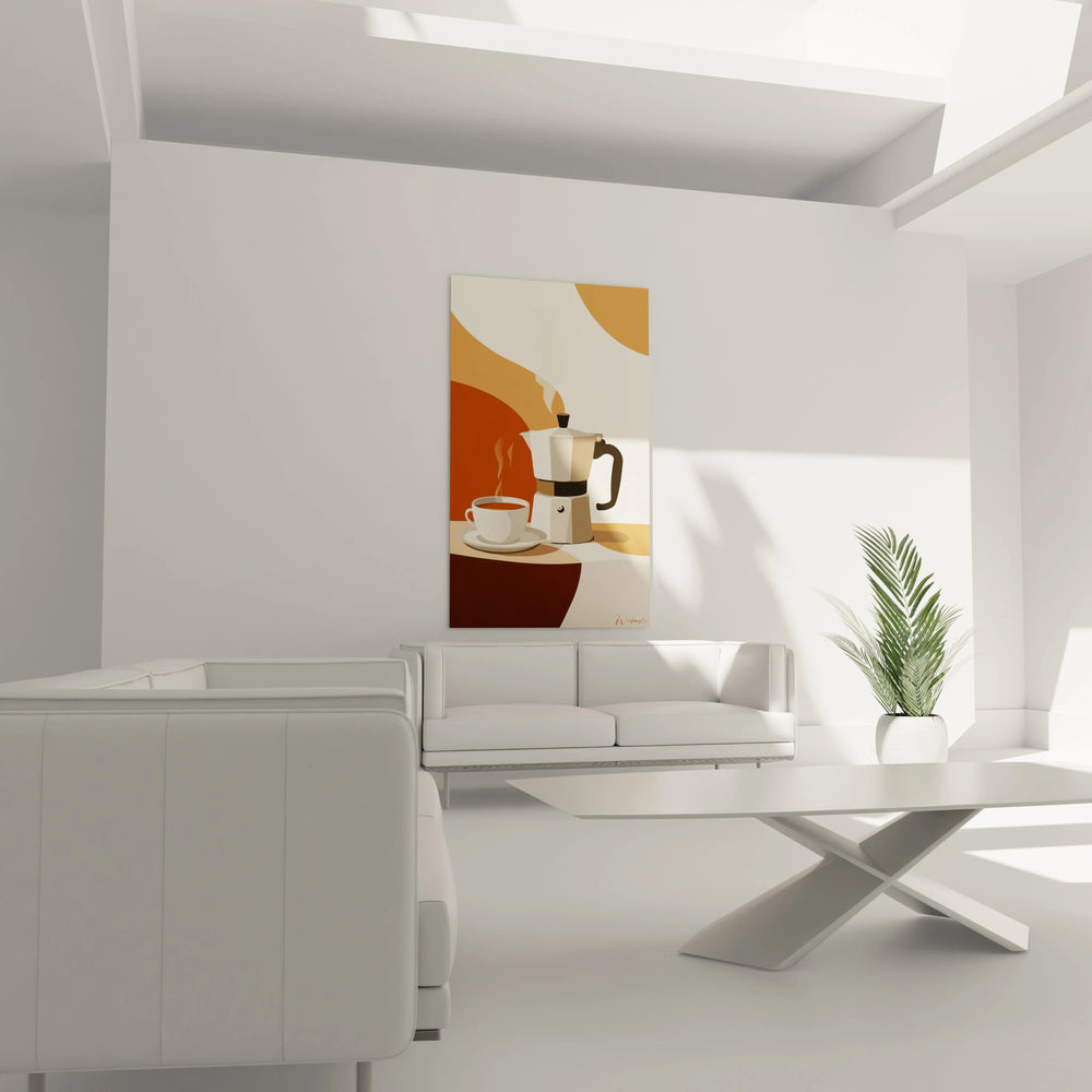 Cette œuvre raffinée capture avec élégance l’essence même du rituel du café, symbolisée par une cafetière italienne iconique et une tasse fumante, dont la vapeur subtile crée un souffle vivant. Jouant sur un style contemporain minimaliste aux lignes épurées, ce tableau harmonise parfaitement formes géométriques et palette chaleureuse. Les tons beige, marron et orange ne sont pas choisis au hasard : ils évoquent la richesse profonde du café moulu, la chaleur d’un comptoir en bois et la lumière douce d’un matin tranquille.