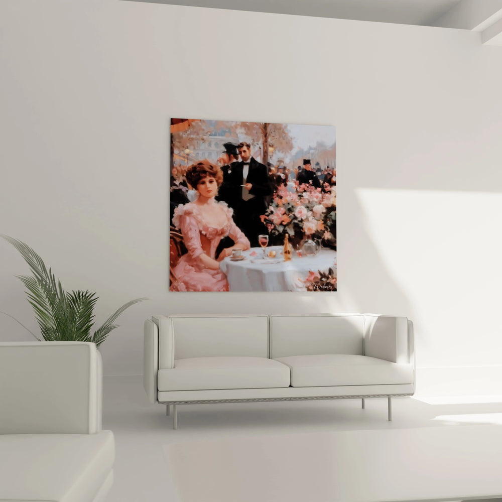 Les éléments distinctifs de cette décoration murale élégance parisienne résident dans plusieurs caractéristiques impossibles à dupliquer. La gestuelle gracieuse de la femme au premier plan, avec sa main délicatement posée, révèle un naturel captivant. Les détails uniques incluent la coiffure élaborée typique de l'époque, les motifs floraux spécifiques qui ornent l'arrière-plan, et l'expression sereine du visage principal. Cette tableau café parisien ambiance bourgeoise se distingue par sa capacité à transformer une scène quotidienne en moment d'exception. L'agencement particulier des objets sur la table - tasse, verre de vin, petits fours - crée une nature morte intégrée qui enrichit la narration visuelle globale.