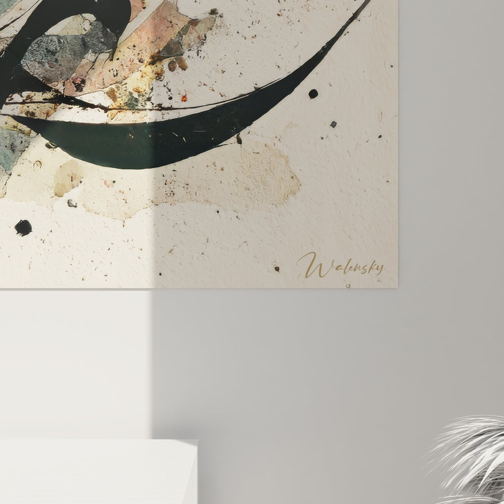 Cette création s'inscrit dans la lignée des grands maîtres de l'art abstrait gestuel, rappelant les techniques de l'action painting et de la calligraphie zen. L'approche libre et expressive de l'artiste évoque l'influence des mouvements artistiques orientaux adaptés à l'esthétique occidentale contemporaine. Cette œuvre d'art murale unique trouvera parfaitement sa place aux côtés d'autres créations abstraites modernes.