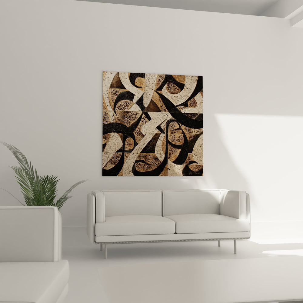 La palette chromatique de ce tableau décoratif culture africaine joue sur les nuances naturelles du bois et de la terre cuite. Les tons ocre, beige et brun évoquent les matériaux traditionnels de l'artisanat africain, créant une harmonie chaleureuse. Cette œuvre calligraphique relief moderne symbolise l'union entre l'héritage spirituel islamique et les techniques artistiques contemporaines, incarnant la continuité culturelle africaine.