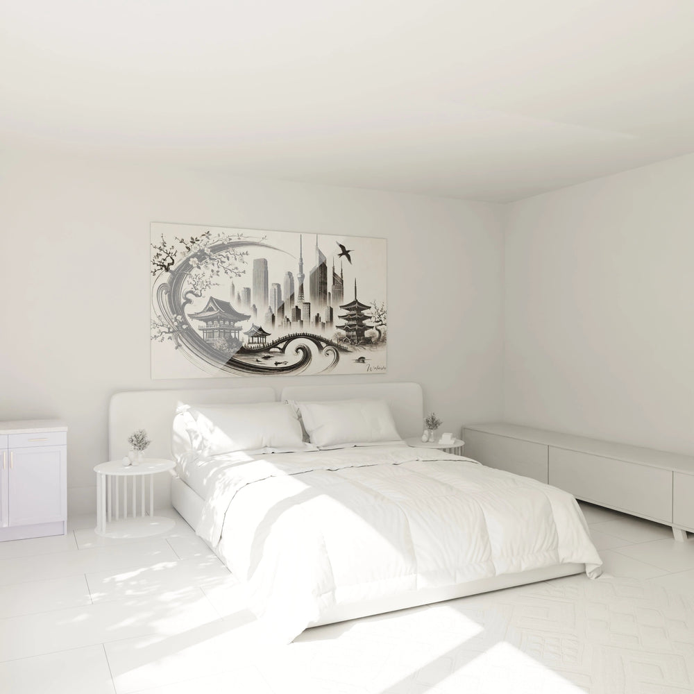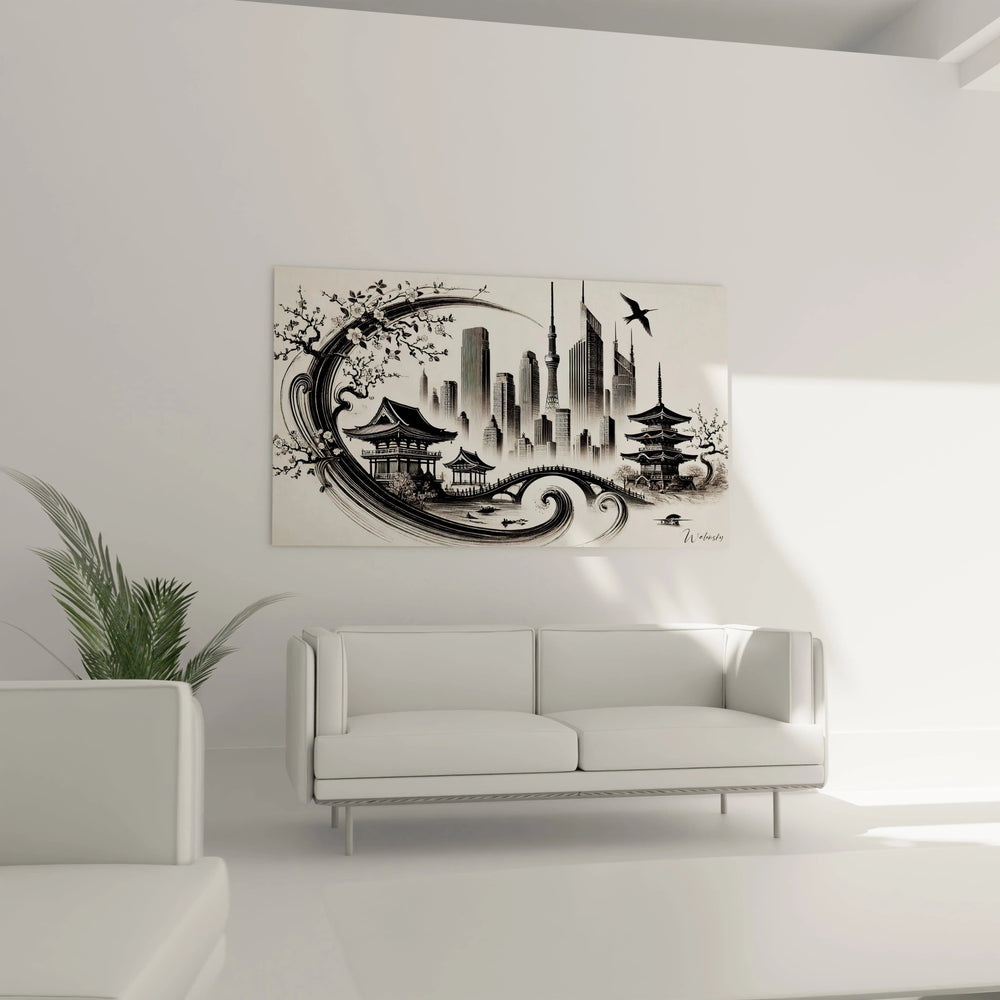 Inspiré par un voyage chargé d’émotions au cœur de Kyoto et Tokyo, ce tableau tire sa force d’un subtil jeu de contrastes. Les lignes calligraphiques, d’une fluidité presque vivante, évoquent la finesse et la discipline ancestrale de la calligraphie japonaise, tandis que les formes architecturales modernes se dressent avec autorité, incarnant la dynamique des grandes villes. Les vagues stylisées, clin d’œil à l’art d’Hokusai, insufflent un mouvement doux, évoquant la continuité et la sérénité. Chaque regard porté sur cette œuvre devient une expérience, une invitation à explorer la beauté de la coexistence entre héritage et progrès.