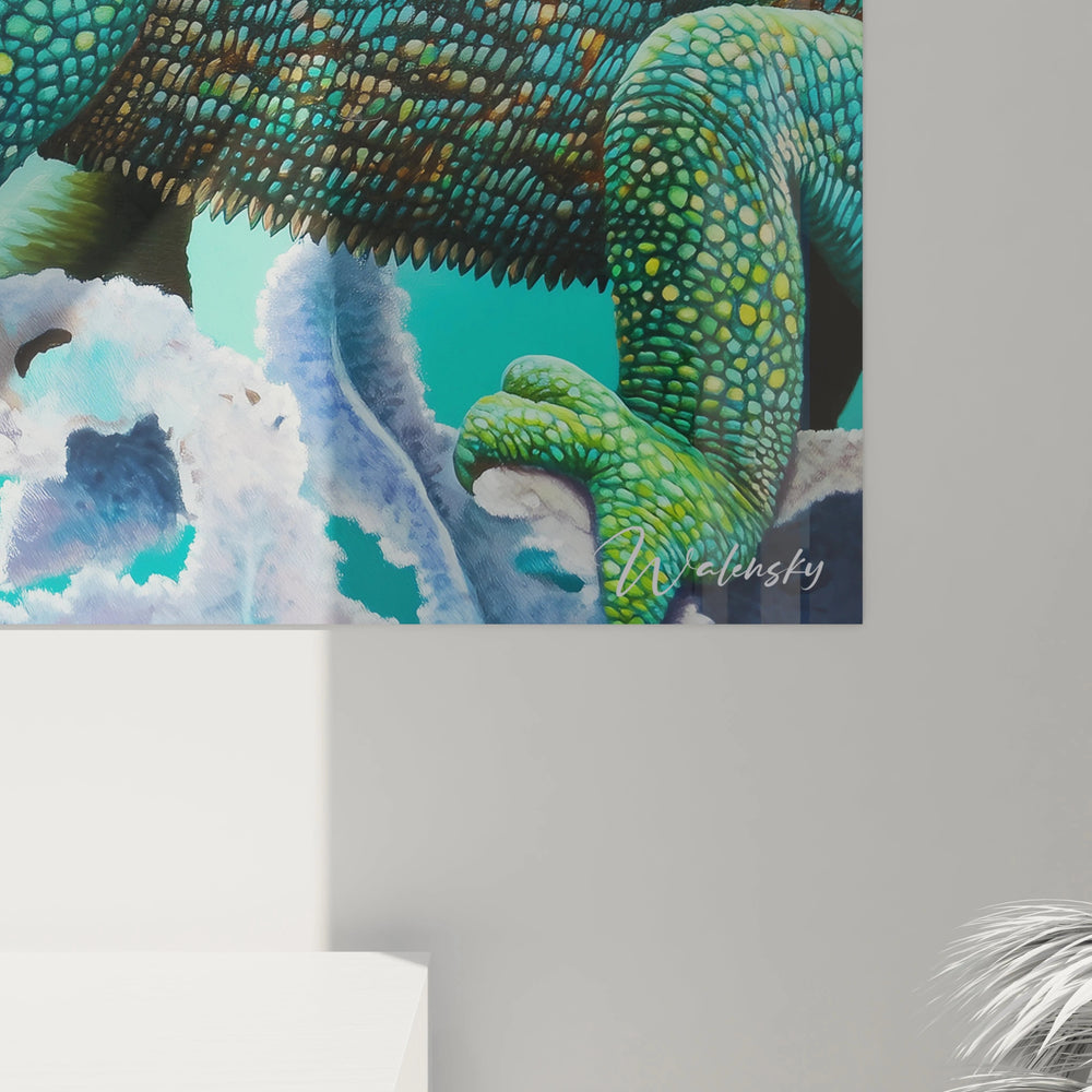 La composition de ce tableau caméléon moderne suit une diagonale dynamique qui guide naturellement le regard du spectateur. Le reptile occupe les deux tiers de l'espace pictural, créant un équilibre visuel parfait selon la règle des tiers. Sa position légèrement de profil permet d'apprécier simultanément les détails faciaux et la silhouette caractéristique du corps. Les éléments cristallins en arrière-plan n'interfèrent jamais avec la lisibilité du sujet principal, servant plutôt d'écrin précieux. Cette œuvre caméléon démontre une maîtrise compositionnelle qui maximise l'impact visuel tout en préservant l'harmonie générale de l'ensemble.