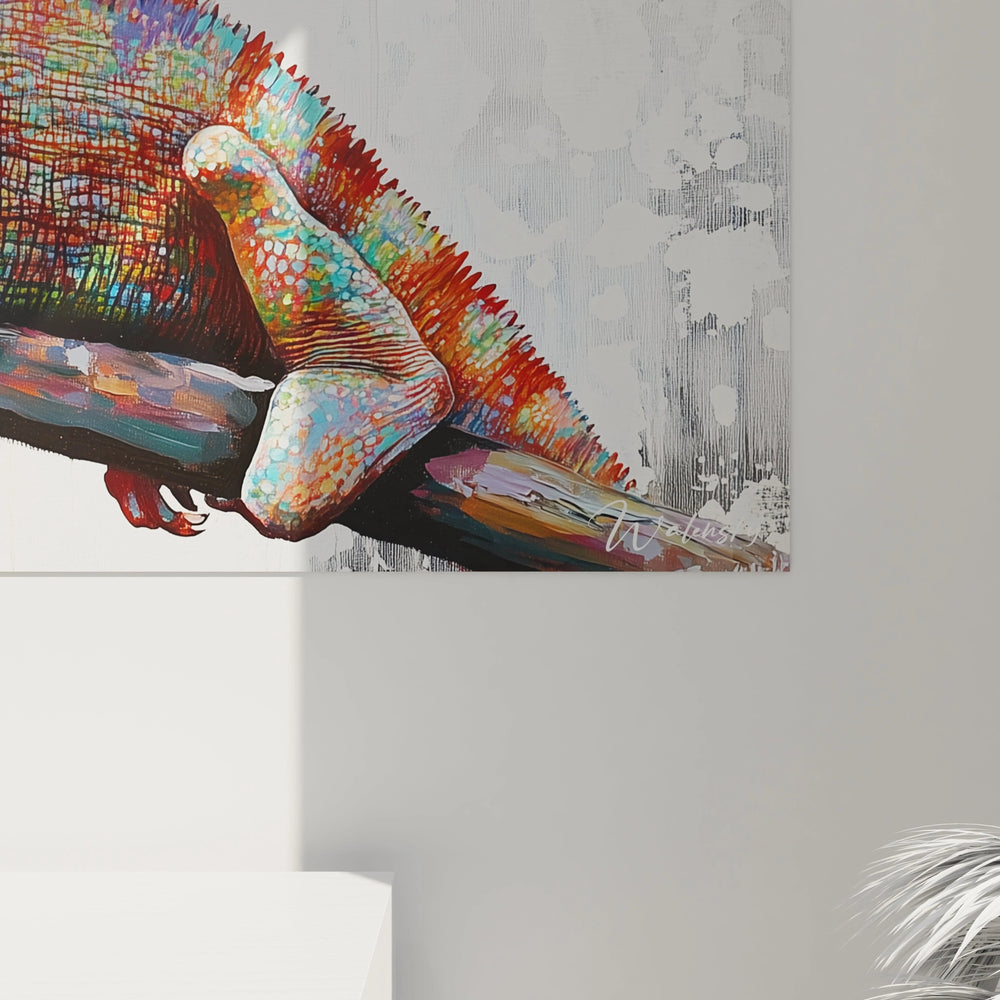 Cette œuvre caméléon artistique se distingue par sa capacité à transformer un animal connu pour sa discrétion en véritable star chromatique. L'originalité réside dans l'interprétation artistique du camouflage naturel, transformé ici en explosion de couleurs assumée. Les détails impossibles à dupliquer incluent les gradients uniques entre chaque écaille et la façon dont les couleurs se fondent naturellement. Le regard perçant du reptile, dirigé vers l'observateur, crée une connexion émotionnelle rare. Cette art mural caméléon exclusif possède une signature visuelle reconnaissable qui la différencie de toute reproduction standard. Les micro-détails dans les pattes, les griffes et la texture de la branche témoignent d'une observation minutieuse de la nature, sublimée par une vision artistique audacieuse.