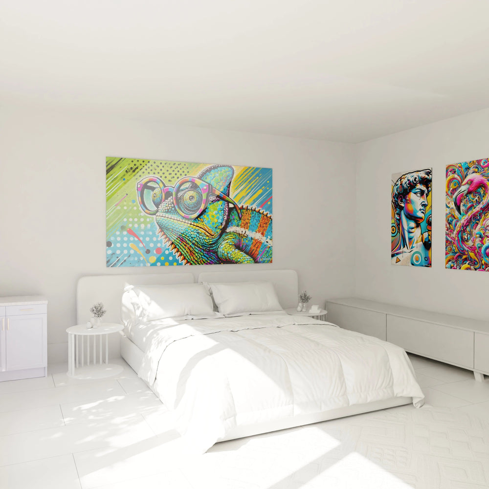 Ce tableau révèle la beauté de l’adaptation et du changement, symbolisés par un caméléon au regard espiègle, orné de lunettes multicolores. Sa silhouette, baignée de nuances éclatantes de verts, bleus et jaunes, respire la liberté d’expression et l’audace. Ici, chaque détail visuel raconte une histoire : celle d’une personnalité qui ose se dévoiler et se réinventer constamment, tout en apportant une touche de fantaisie à votre univers.