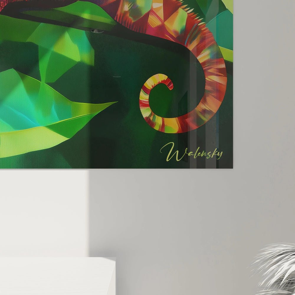 La composition de ce tableau caméléon technique digitale révèle une maîtrise parfaite de l'équilibre visuel. Le reptile occupe une position centrale dynamique, son corps serpentant gracieusement le long d'une branche sombre qui traverse la toile en diagonale. Cette ligne directrice crée un mouvement naturel qui guide l'œil du spectateur à travers l'ensemble de l'œuvre. L'arrière-plan tropical luxuriant forme un écrin de verdure stylisé, avec des feuilles géométriques aux tons jade et émeraude qui encadrent parfaitement le sujet principal. La perspective légèrement plongeante permet d'admirer les détails complexes de la crête dorsale et des motifs colorés qui ornent le corps de l'animal.