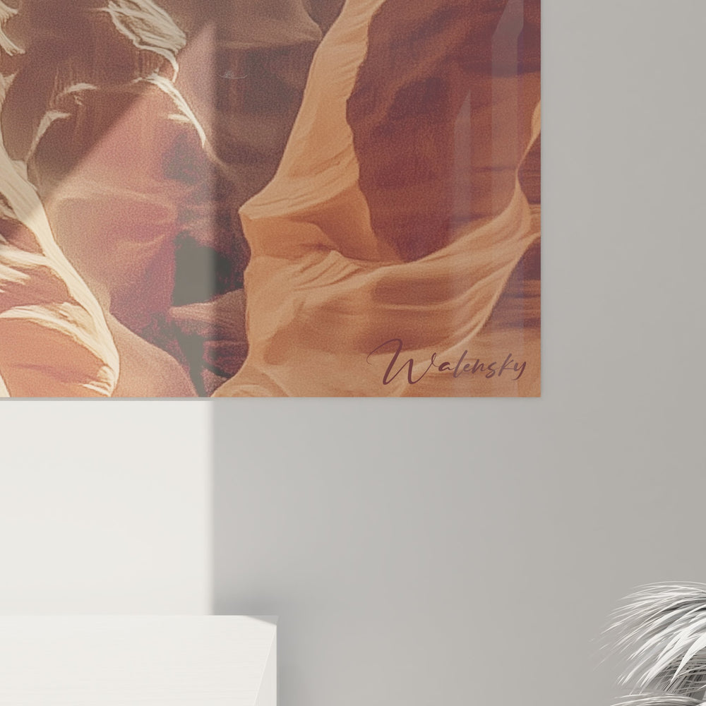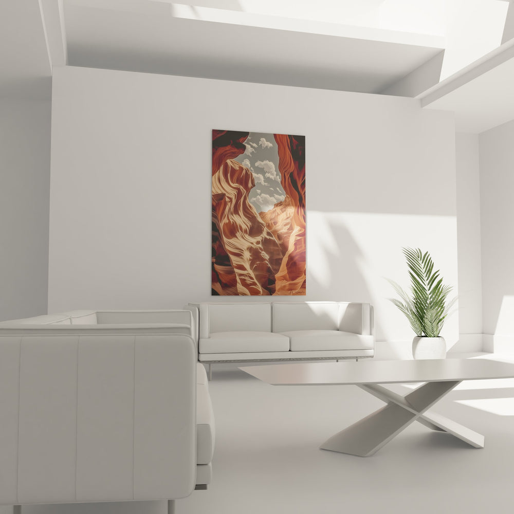 Ce tableau mural canyon capture la beauté saisissante d'Antelope Canyon avec ses parois rocheuses sculptées par des millénaires d'érosion. L'œuvre révèle les formations géologiques ondulantes caractéristiques de ce site mythique, où la lumière naturelle filtre à travers l'ouverture supérieure pour créer un spectacle visuel extraordinaire. Les courbes organiques des roches semblent danser dans un ballet minéral, offrant une perspective unique sur ces gorges naturelles sculptées par l'eau. Ce tableau décoratif canyon met en valeur la texture striée des parois, révélant les couches sédimentaires accumulées au fil des âges géologiques. L'artiste a su capter l'essence même de ces formations rocheuses exceptionnelles, transformant cette merveille naturelle en une œuvre d'art murale captivante. La composition verticale guide le regard vers les nuages visibles en arrière-plan, créant un contraste saisissant entre l'intimité protectrice du canyon et l'immensité du ciel. Cette décoration murale gorges naturelles apporte une dimension contemplative et majestueuse à tout espace intérieur.