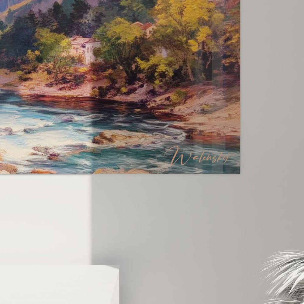 Ce tableau mural canyon présente une vue spectaculaire d'un paysage de gorges aux teintes roses et orangées baignées par la lumière dorée du couchant. La composition révèle un canyon aux falaises majestueuses qui s'élèvent de part et d'autre d'une rivière sinueuse aux eaux cristallines. Les formations rocheuses imposantes dominent le paysage avec leurs parois verticales sculptées par l'érosion, créant un contraste saisissant avec la végétation luxuriante qui orne les berges. Cette œuvre d'art gorges et canyons capture parfaitement l'essence sauvage de ces paysages naturels extraordinaires. Les arbres aux feuillages automnaux ponctuent la scène de touches de vert et d'ocre, tandis qu'un ciel nuageux aux nuances rosées complète cette représentation artistique de canyon. La technique picturale met en valeur les jeux d'ombre et de lumière qui animent ces falaises colorées, créant une profondeur remarquable. Ce tableau décoratif paysage canyon transporte l'observateur au cœur d'une nature préservée où règnent la sérénité et la grandeur. L'artiste a su saisir la beauté brute de ces formations géologiques spectaculaires en harmonisant les couleurs chaudes des roches avec la fraîcheur des eaux vives qui serpentent dans cette vallée encaissée.