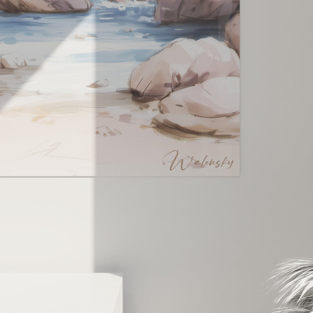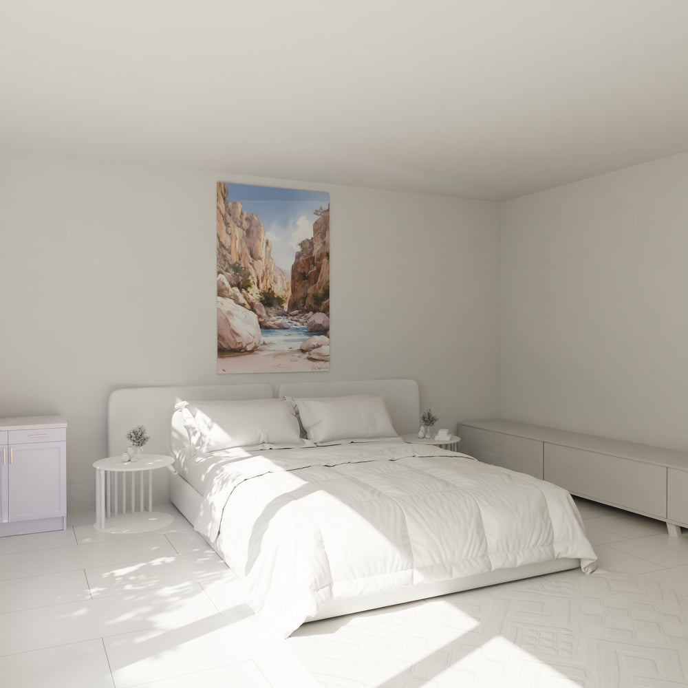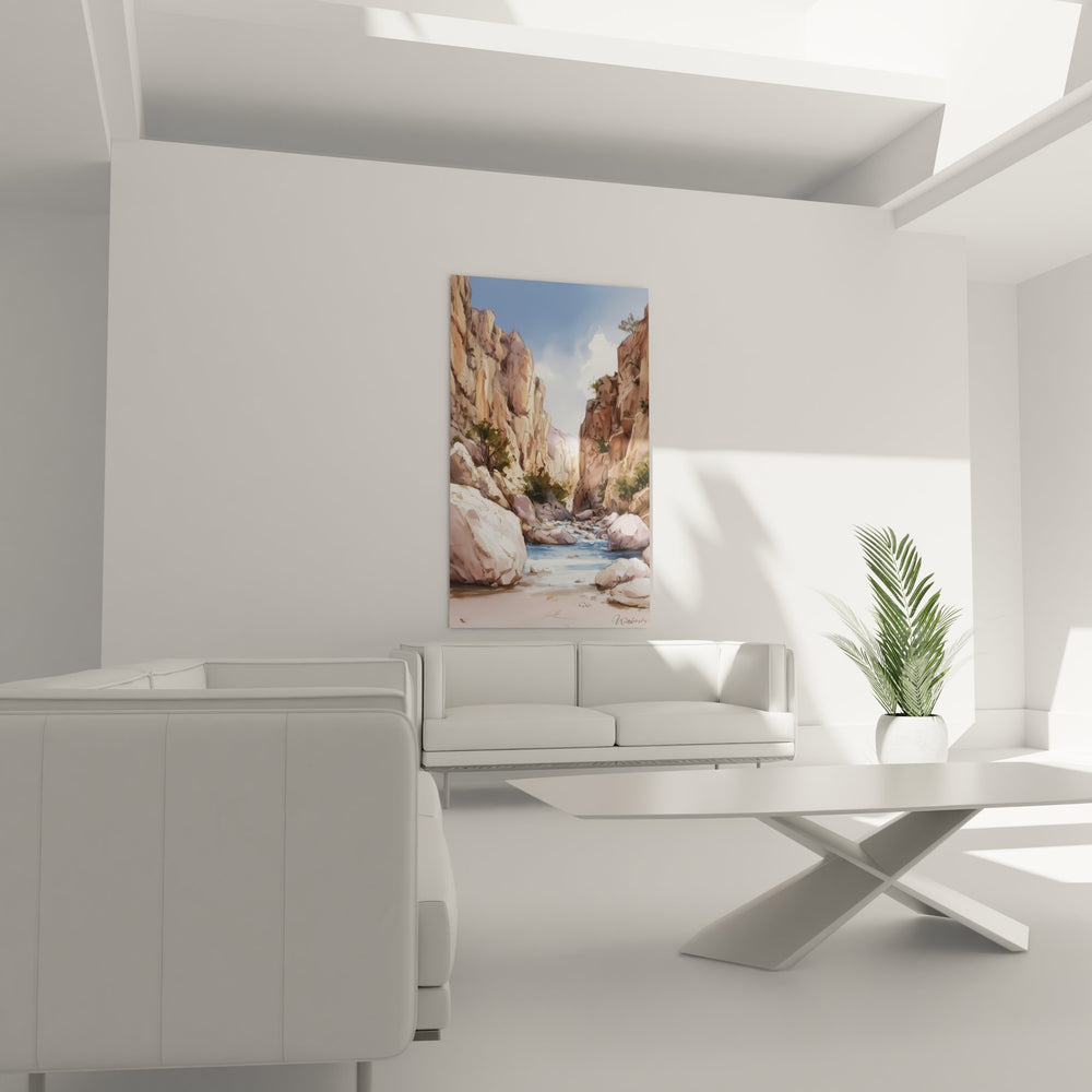 Ce tableau mural canyon offre une vision saisissante d'un paysage désertique où une rivière aux eaux bleues serpente entre d'imposantes falaises de grès. L'artiste Walensky a magistralement capturé l'essence de ces gorges naturelles aux tons ocre et beige, créant une composition qui évoque la grandeur des paysages du Sud-Ouest américain. Les formations rocheuses s'élèvent majestueusement de chaque côté du cours d'eau, leurs parois sculptées par des millénaires d'érosion révélant des strates géologiques aux nuances subtiles. La végétation désertique parsème discrètement les anfractuosités des rochers, apportant des touches de vert qui contrastent harmonieusement avec les tons chauds de la pierre. Ce tableau nature sauvage transporte le spectateur au cœur d'un canyon américain authentique, où le silence n'est troublé que par le murmure de l'eau claire. L'œuvre révèle une technique picturale raffinée, mêlant réalisme et impressionnisme pour restituer la texture rugueuse des parois rocheuses et la fluidité de l'eau. Cette peinture paysage désertique constitue un véritable voyage visuel vers des terres préservées et sauvages.