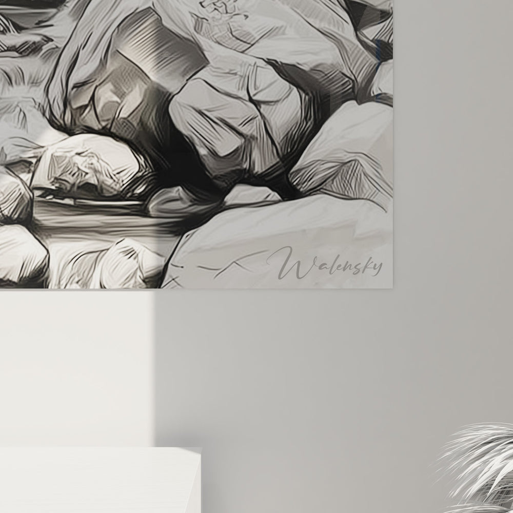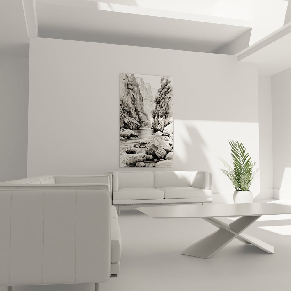 La palette monochrome de ce tableau art canyon naturel évoque la sérénité et l'intemporalité des formations géologiques anciennes. Les nuances de gris et les contrastes subtils symbolisent la permanence face au temps qui passe, tandis que l'eau représente le mouvement perpétuel et la vie. Cette décoration murale gorges inspire la contemplation et la connexion avec les forces primordiales de la nature.