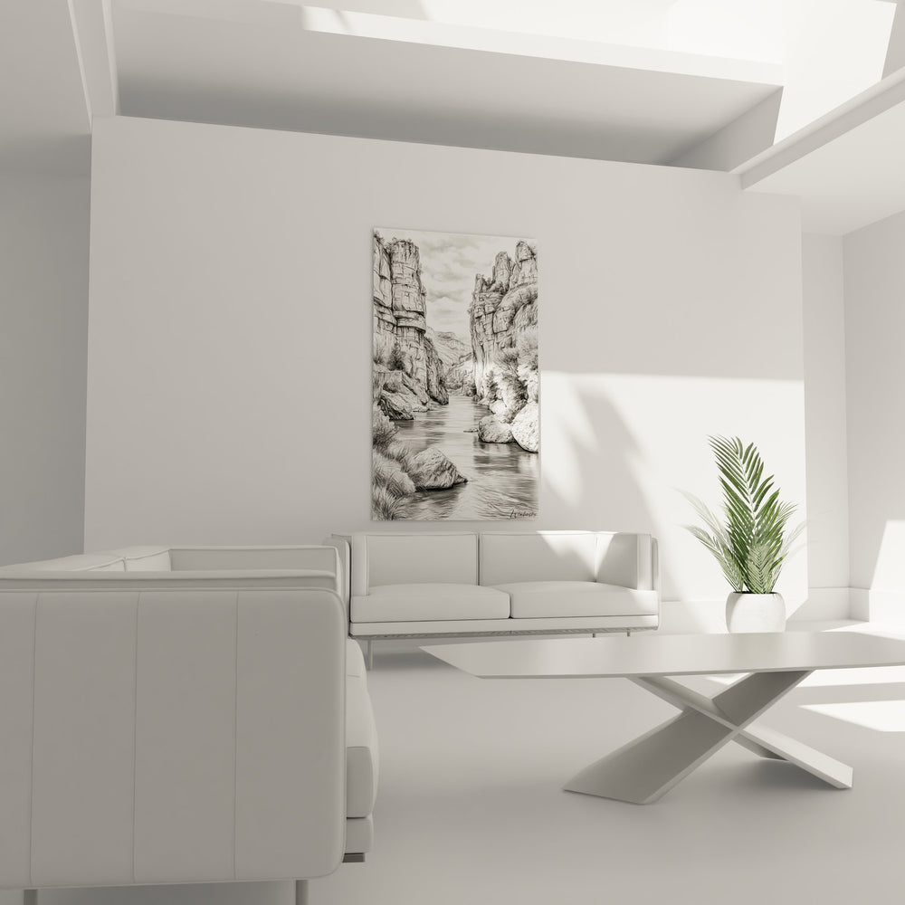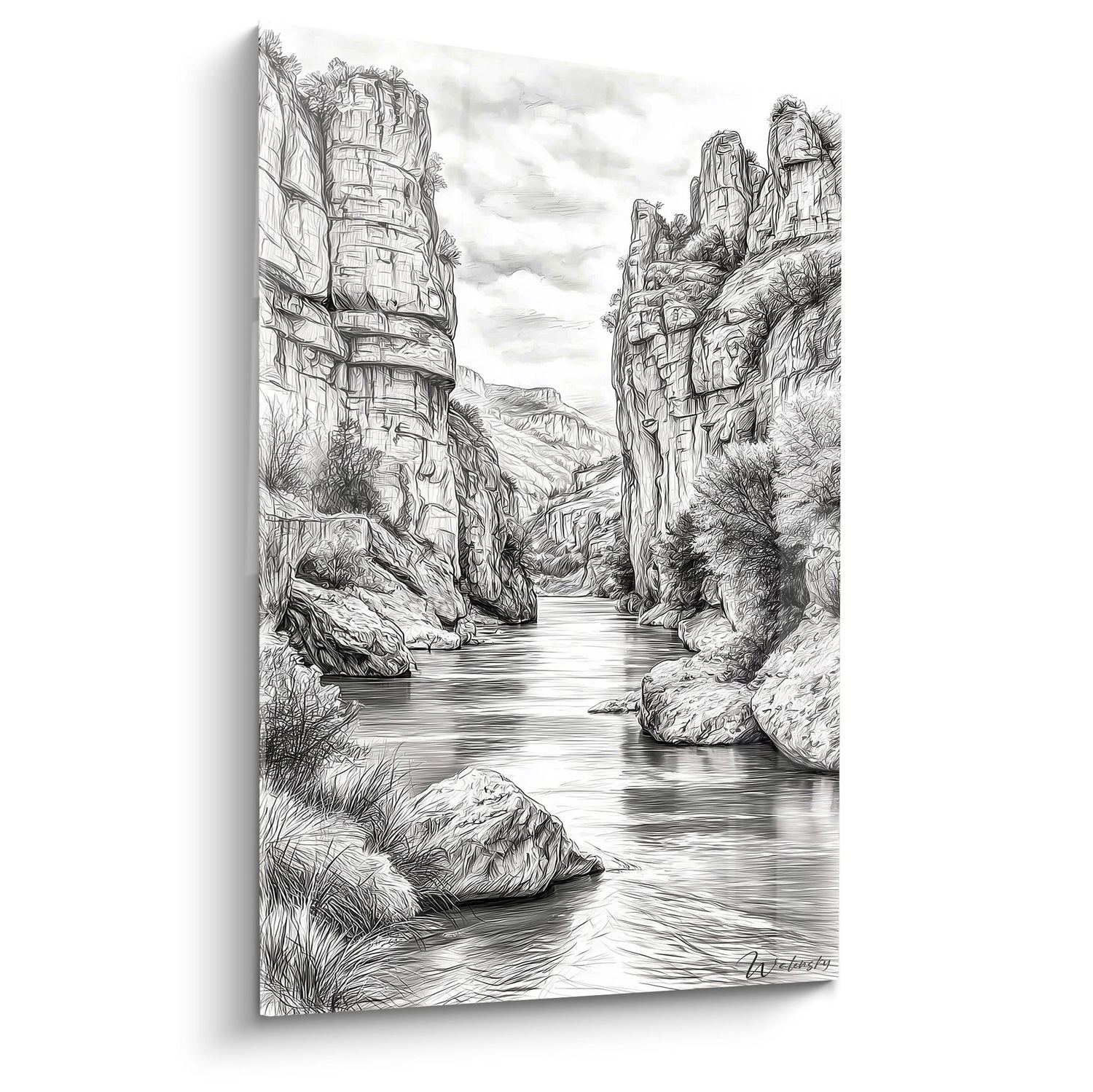 Ce tableau mural canyon présente une vision saisissante d'un paysage de gorges rocheuses baigné par une rivière sinueuse. L'œuvre capture avec une précision remarquable les imposantes falaises calcaires qui s'élèvent de part et d'autre du cours d'eau, créant un corridor naturel d'une beauté saisissante. Les détails minutieux révèlent la texture rugueuse des parois rocheuses, sculptées par des millénaires d'érosion. La décoration murale gorges met en valeur les stratifications géologiques visibles sur les faces des falaises, témoins silencieux du temps qui passe. Au premier plan, des blocs rocheux émergent paisiblement de l'eau claire, créant un jeu de reflets subtils à la surface. La végétation clairsemée, accrochée aux anfractuosités des rochers, apporte une touche de vie à ce paysage canyon dramatique. Ce tableau gorges et canyons transporte l'observateur dans un voyage contemplatif au cœur d'un environnement préservé, où la nature règne en maître absolue. L'artiste a su capturer l'essence même de ces formations rocheuses spectaculaires, offrant une fenêtre sur un monde où le temps semble suspendu.