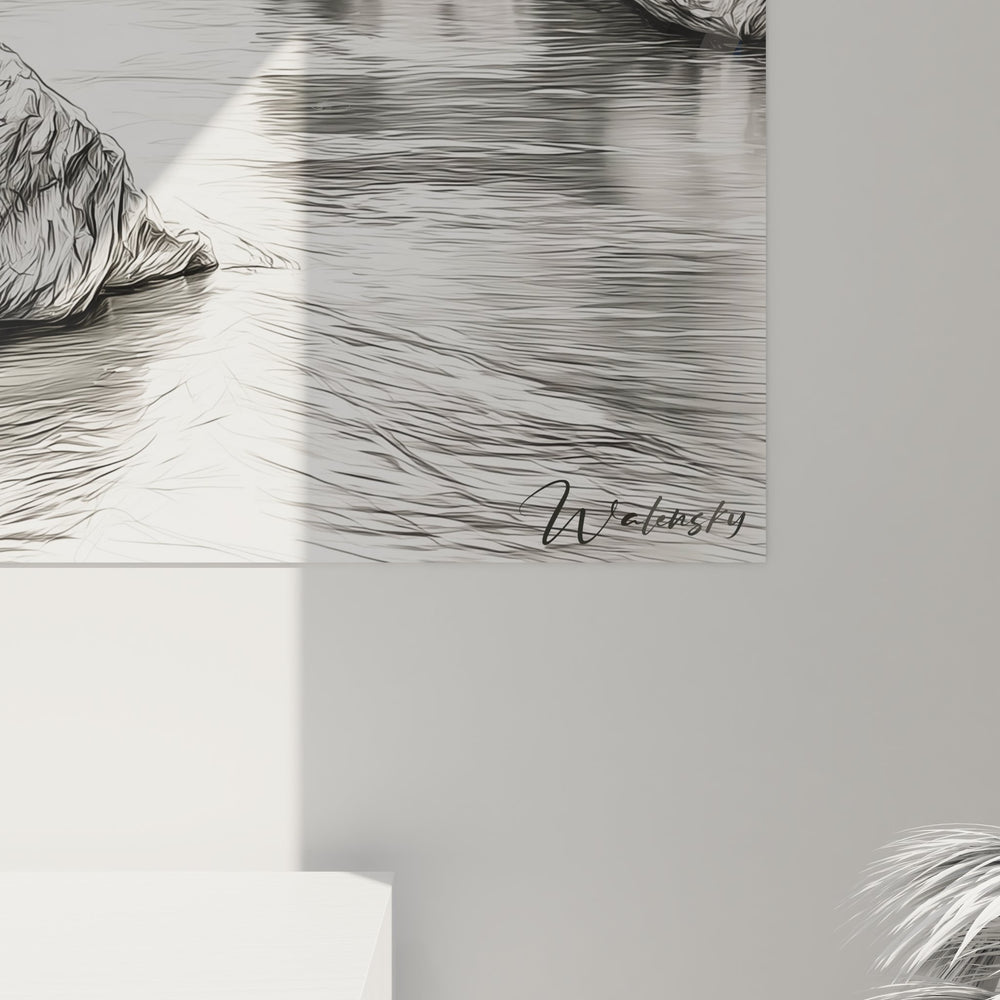 Cette œuvre d'art canyon développe une symbolique profonde autour de la permanence et de la sérénité. La palette monochrome en nuances de gris confère à l'ensemble une intemporalité remarquable, évoquant la sagesse millénaire des roches. Les contrastes subtils entre les zones d'ombre et de lumière créent une profondeur émotionnelle qui invite à la méditation et à l'introspection.