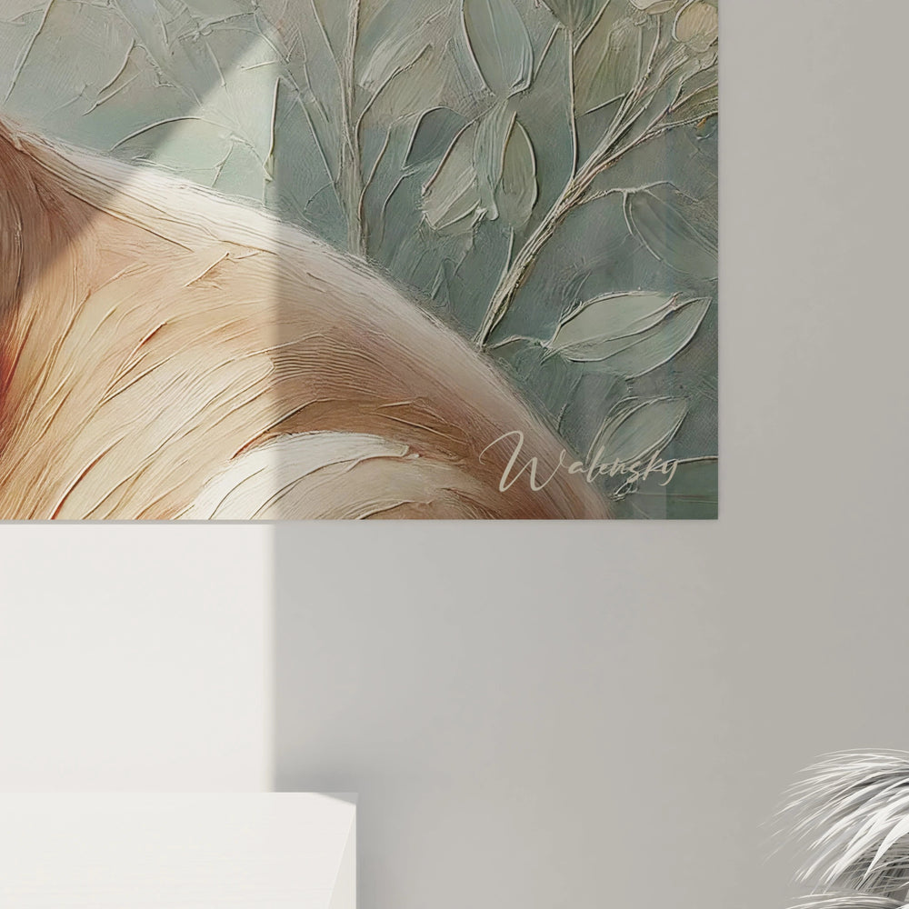 Chaque regard porté à ce tableau vous transporte dans une atmosphère enveloppante, douce et sereine. Les teintes subtiles de beige, de vert tendre et de blanc crème forment une palette chaleureuse aux nuances naturelles qui invitent à la contemplation et à la détente. La posture paisible du kangourou, posé comme en plein rêve, contribue à instaurer une sensation de bien-être immédiat.