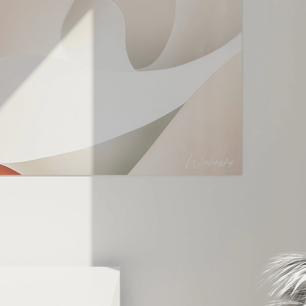 Ce tableau abstrait rose présente une composition organique sophistiquée dominée par des formes fluides et courbes. L'œuvre révèle immédiatement une harmonie chromatique apaisante où les tons rosés se mêlent délicatement aux nuances beiges et blanches. Le tableau abstrait moderne rose capture l'attention par ses volumes tridimensionnels qui semblent flotter dans l'espace. Les formes ondulantes créent un mouvement visuel hypnotique, évoquant la douceur du satin ou la fluidité de la soie. Cette décoration murale abstrait rose transforme instantanément l'atmosphère d'un espace par sa présence apaisante et raffinée.