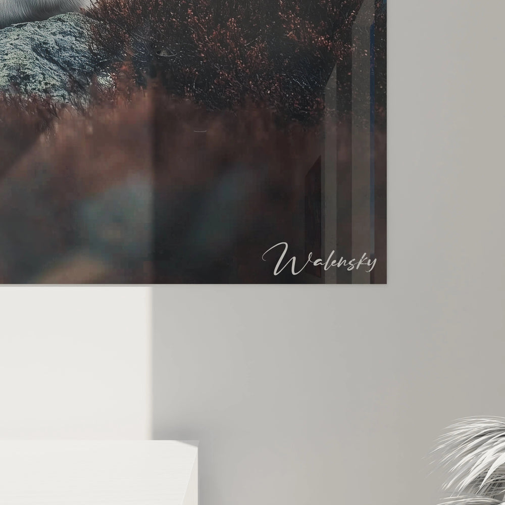 L'éclairage joue un rôle crucial pour révéler toutes les subtilités de cette œuvre. Un éclairage directionnel doux, idéalement avec une température de couleur neutre à froide (environ 4000-5000K), mettra en valeur les détails du pelage blanc sans créer de reflets gênants. Dans un espace contemporain, cette œuvre s'associera élégamment avec des matériaux naturels comme le bois clair, la pierre, ou des textiles aux textures variées dans des tons de bleu, gris et blanc. Pour un contraste dynamique qui accentuera la présence du tableau, quelques éléments décoratifs en bois foncé ou en cuir brun rappelant les teintes du premier plan créeront une continuité visuelle avec l'œuvre.