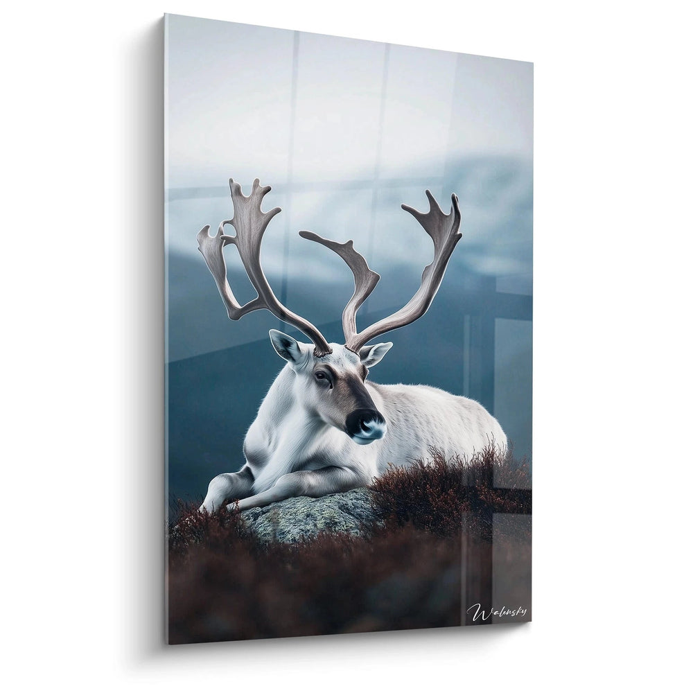 Dans cette représentation, le caribou blanc évoque la pureté et la résilience de la faune arctique. Sa position surélevée et son regard direct suggèrent une présence noble et consciente, tandis que ses bois impressionnants symbolisent la force naturelle et le renouveau cyclique, ces formations osseuses étant renouvelées chaque année.