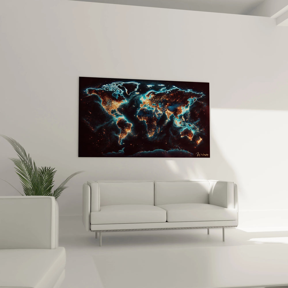 Imaginez-vous contempler la Terre depuis l’espace, émerveillé par la magie des villes illuminées qui dessinent, telles des joyaux scintillants, les contours de chaque continent. Le Tableau Carte du Monde N°2 capture avec élégance et finesse ce spectacle fascinant, invitant la lumière à révéler la beauté cachée de notre planète la nuit.