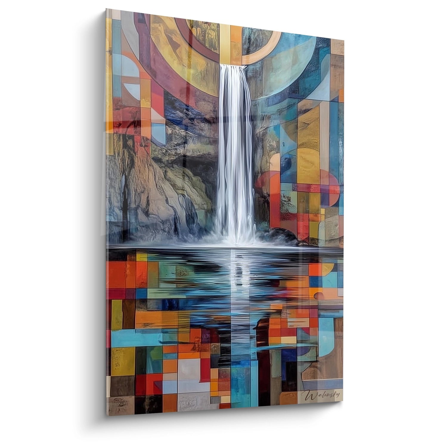 Ce tableau mural cascade présente une interprétation artistique saisissante d'une chute d'eau naturelle sublimée par un traitement géométrique contemporain. L'œuvre combine habilement réalisme photographique et abstraction géométrique, créant un tableau moderne cascade d'une originalité remarquable. Au centre de la composition, une majestueuse cascade blanche s'élance verticalement, contrastant avec un environnement rocheux traité de manière naturaliste. Cette chute d'eau décorative murale est encadrée par une mosaïque de formes géométriques aux couleurs vives : carrés, rectangles et cercles se chevauchent dans une harmonie chromatique sophistiquée. Les tons oranges, bleus turquoise, rouges vermillon et jaunes dorés créent un art mural cascade coloré qui transforme la représentation classique d'un paysage naturel en œuvre d'art contemporaine. La partie inférieure révèle le bassin de réception de la cascade, où l'eau se reflète paisiblement, également fragmenté par cette approche géométrique innovante. Cette décoration murale cascade moderne offre une vision artistique unique qui marie parfaitement la beauté naturelle de l'eau en mouvement avec l'esthétique géométrique contemporaine, créant un tableau design cascade parfait pour les intérieurs modernes et sophistiqués.