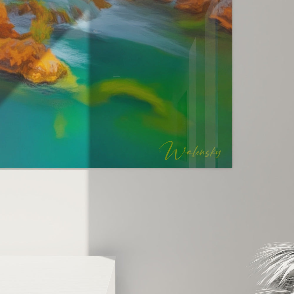 Ce tableau mural cascade présente une vision enchanteresse d'une cascade naturelle dans un décor automnal flamboyant. L'artiste a capturé avec virtuosité le mouvement perpétuel de l'eau qui dévale en cascades successives à travers un paysage rocheux aux teintes chaudes. Les arbres aux feuillages dorés encadrent majestueusement la scène, créant un contraste saisissant avec les eaux turquoise et émeraude qui serpentent entre les rochers ocre et orange. Cette œuvre d'art murale nature révèle une technique picturale sophistiquée où les reflets de la lumière sur l'eau sont rendus avec une précision remarquable. Le tableau décoratif paysage dégage une atmosphère à la fois dynamique et apaisante, où chaque élément naturel trouve sa place dans une composition harmonieuse. Les nuances de bleu profond de l'eau contrastent magnifiquement avec les tons chauds de l'automne, créant une décoration murale contemporaine qui captive le regard. L'artiste a su maîtriser les jeux d'ombres et de lumières pour donner vie à cette cascade, transformant ce tableau nature moderne en véritable fenêtre ouverte sur un paradis naturel préservé.