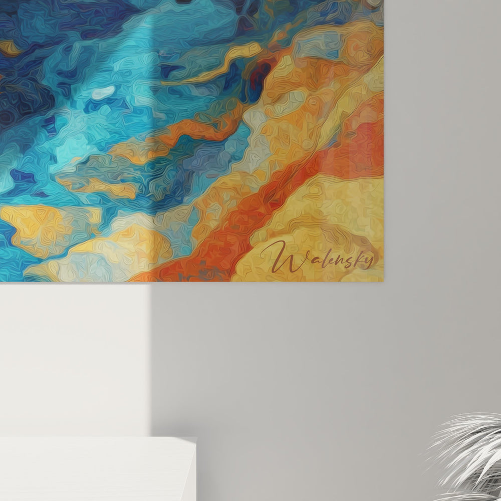 La palette chromatique de cette œuvre d'art cascade révèle une symbolique profonde mêlant purification et élévation spirituelle. Les bleus turquoise de l'eau symbolisent la sérénité et le renouveau, contrastant avec les ors cosmiques évoquant la sagesse universelle. Les tons orangés représentent la vitalité terrestre, créant un équilibre parfait entre les énergies célestes et terrestres dans cette composition artistique exceptionnelle.