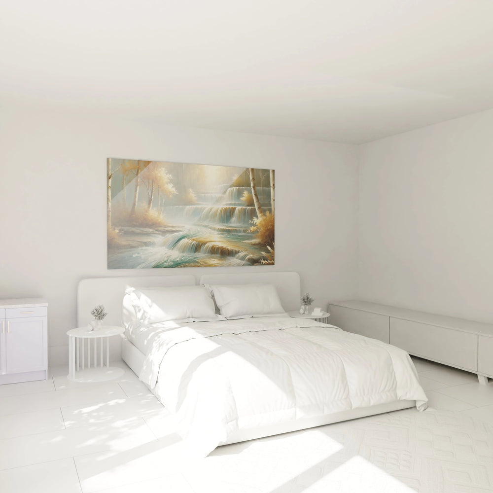 Chaque détail de ce tableau a été pensé pour évoquer cette fluidité apaisante de l'eau qui danse au rythme de la lumière. La cascade prend vie sous vos yeux, enveloppée d’une douce brume dorée qui illumine la scène avec délicatesse. Les couleurs soigneusement choisies – un bleu rafraîchissant mêlé à des tonalités d’or et de beige – créent un équilibre parfait entre chaleur et fraîcheur, invitant ainsi à une pause revitalisante au cœur de votre intérieur.